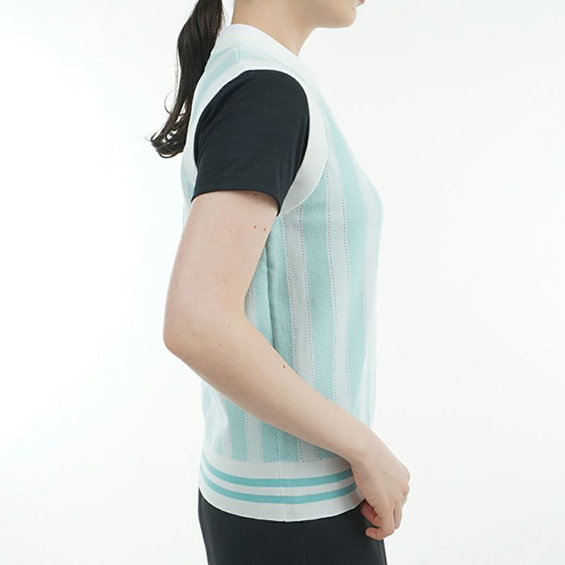 商品説明 ポリエステルを使用したジャカードニットのドライタッチベスト。 静電気軽減リンキング糸を使用し、快適な着用感を提供します。格子を組み合わせたストライプ柄とバックに配置されたロゴがデザインのポイントです。 シンプルでありながら、機能性とスタイルを兼ね備えたアイテムです。初春にコーディネートのアクセントになるニットベストです。