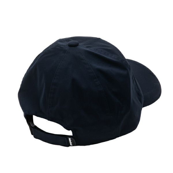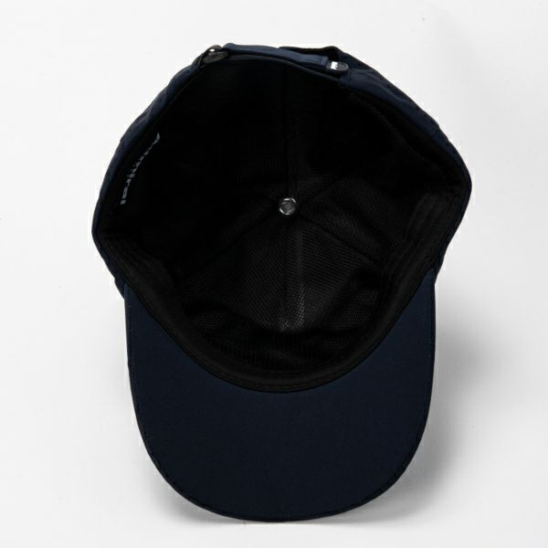 レインウェアの素材を使用した撥水キャップ。つば先はウレタンを挟み込むことで、雨の滴を抑制します。