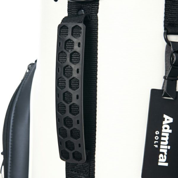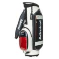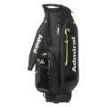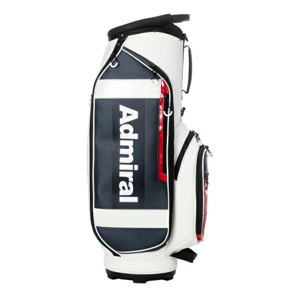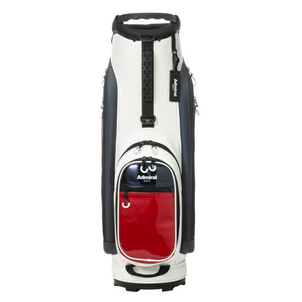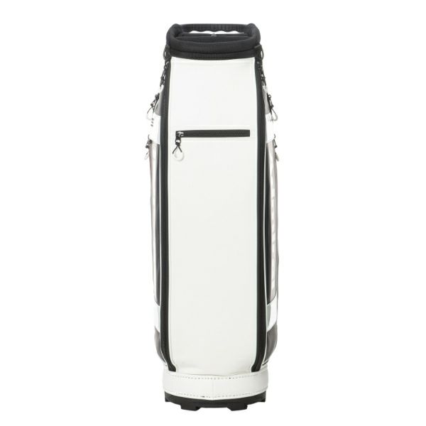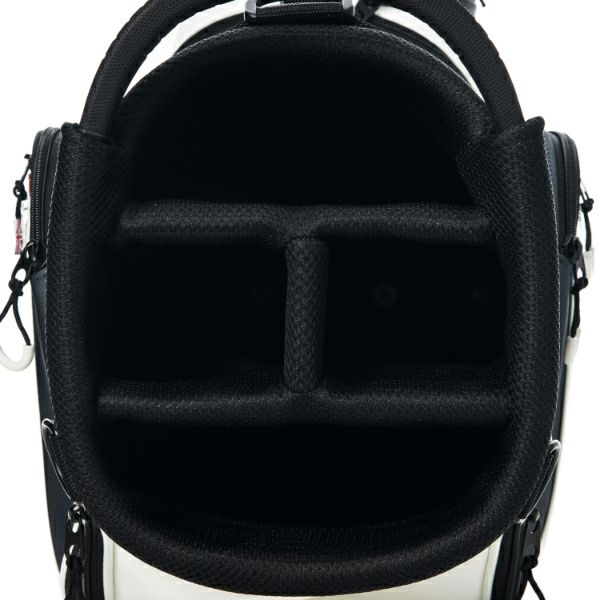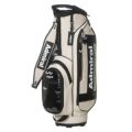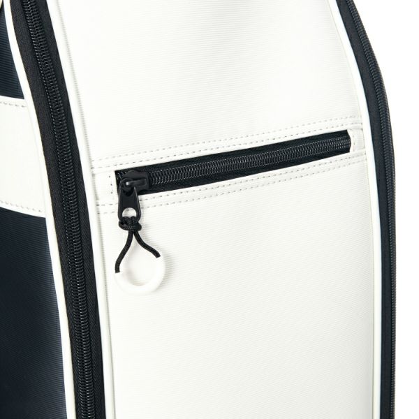 商品説明 カートキャディバッグ。細かい表面感のある模様のシンセティックレザーが高級感漂う商品。サイドパネルとフロントにはスポーティなエナメル素材が施されたデザインが特徴です。口枠9型4分割と内部セパレーター3分割あり整理整頓が可能。ポケット10箇所で収納力があり、機能的でシンプルながらも高級感あるアイテム。