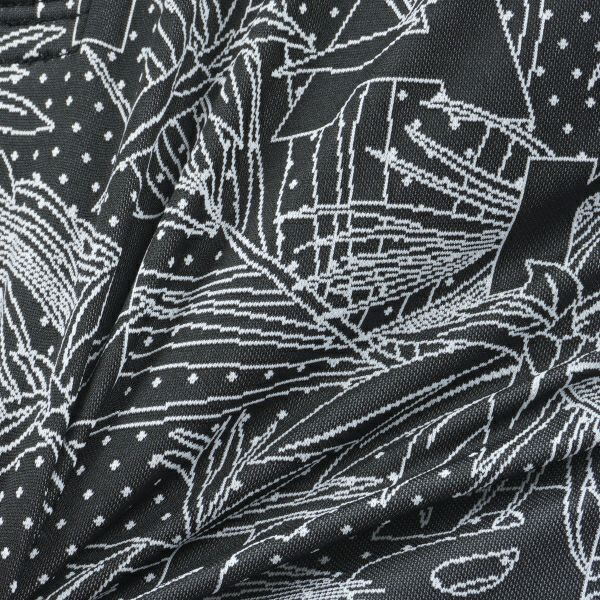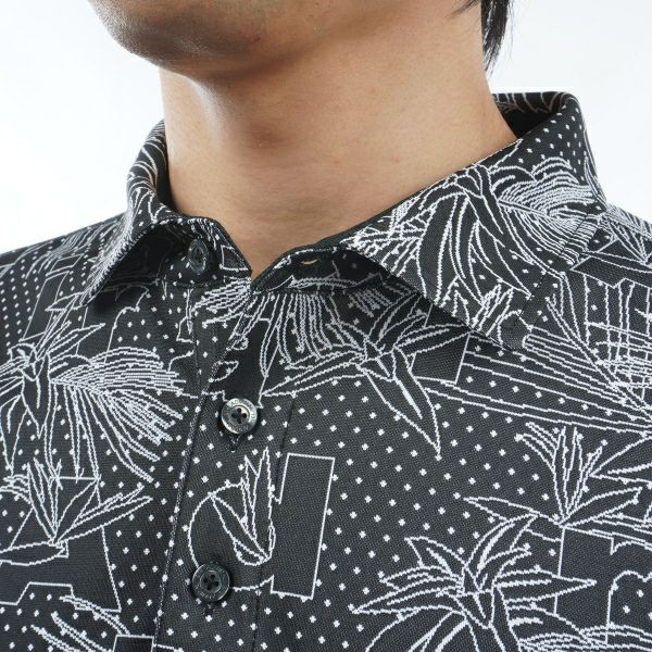 商品説明 ツートンカラーのリーフ柄を北陸産地で編み上げたジャカード素材を使用。細い糸を使い密に仕上げた繊細な柄がメイドインジャパンならではの素材です。台衿裏はメッシュ素材を使用し首回りのベタつきを軽減します。左袖ワッペン使用の高級感あるデザインです。