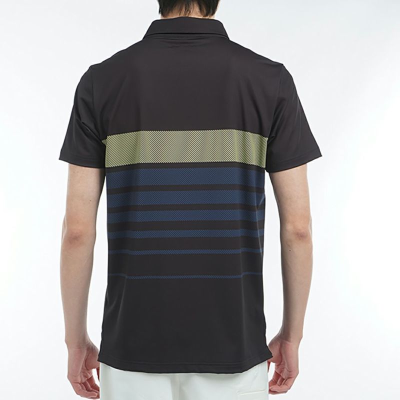 商品説明 吸水速乾性とUVカット機能を備えたポリエステル天竺素材を使用し、グラデーションボーダープリントシャツ。 異なる太さのボーダーがグラデーション状に配置され、爽やかな印象を与えます。 ストレッチ性に優れた生地で、アクティブなゴルフシーンに適した快適な着心地を提供します。