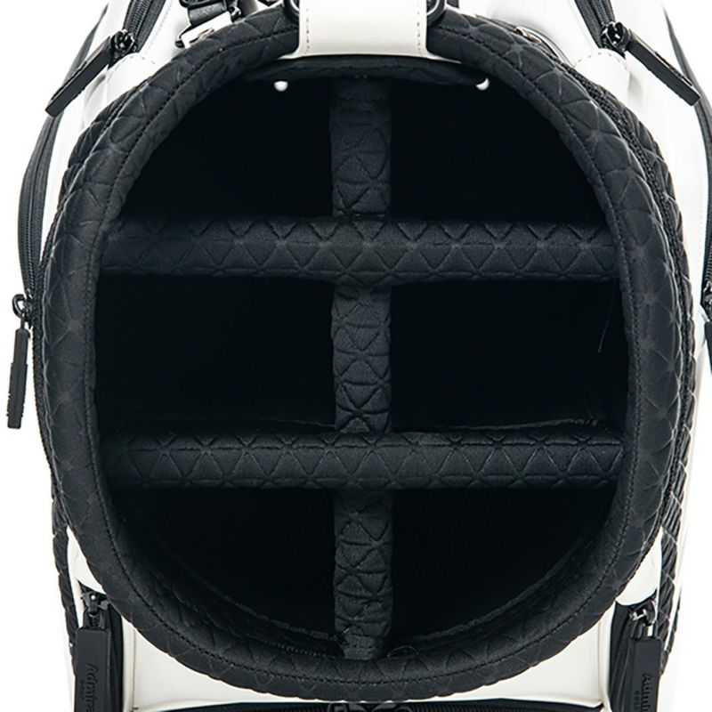 商品説明 このキャディバッグは、口枠が9型でマルチグリップスタイルを採用しています。収納ポケットは全9つあり、使い勝手が良く、必要なアイテムをすっきりと収納できます。ボトムにはスプリング安定ボトムが採用されており、安定した設置が可能です。ウエルダーロゴがデザインの一部を飾り、両サイドの成型パーツにはスポーツモデルの特徴的なデザインが施されています。口枠6分割、セパレーター数3分割。