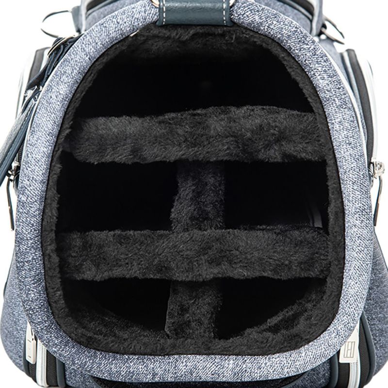 商品説明 レザー調生地に風合いのある色の合皮を組み合わせたキャディバッグ。カジュアルな中にも高級感が漂い、前面には4つのポケット、背面にも収納スペースが装備されています。3点式ショルダーストラップと、ステッチのアクセントカラーが特徴で、特別ネームプレートも付いています。口枠5分割、セパレーター数3分割。