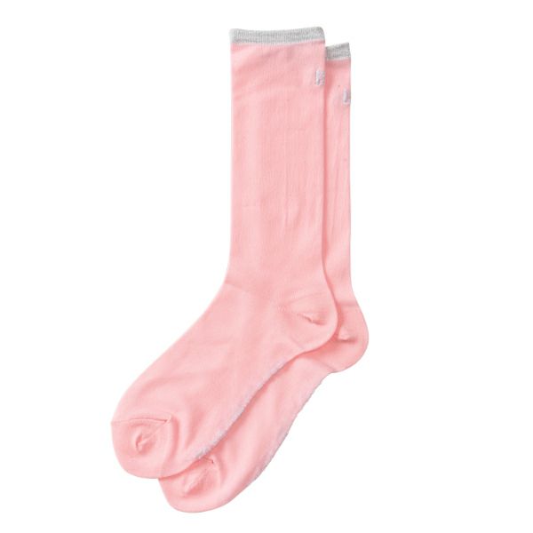 コーディネートのアクセントになるカラーシアーソックス。ロゴとリブに銀糸を施し、女性らしさを演出。