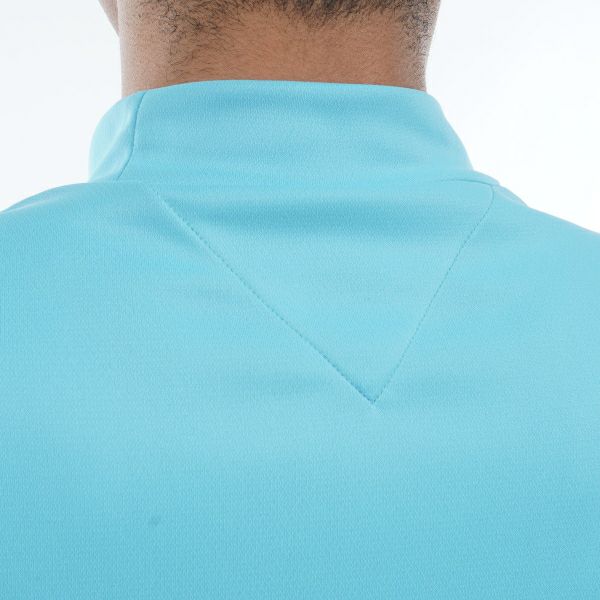 サスティナブルなリサイクルポリエステルを使用した鹿の子を採用しました。胸ロゴとラインがポイントのモックネックシャツです。