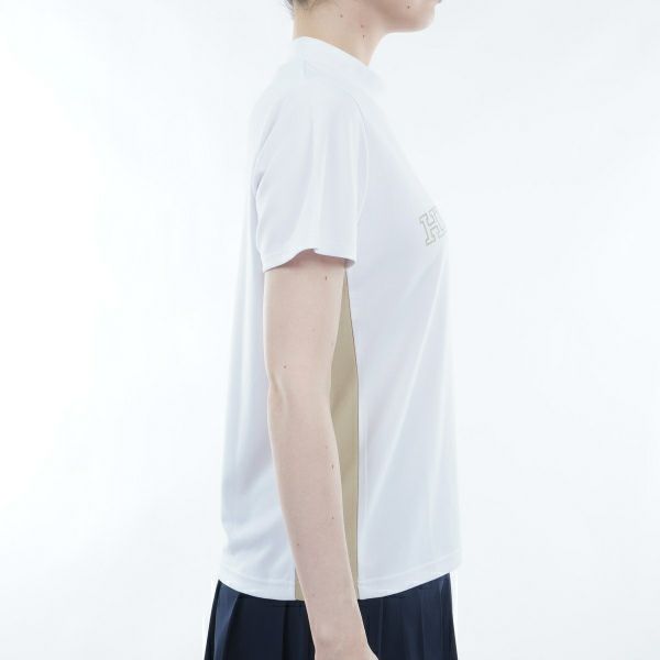 カレッジライクなアーチロゴプリントがポイントのモックネックシャツ。さらりと軽いポリエステル素材を使用し、脇には配色を入れることでシャープなボディーラインを強調します。