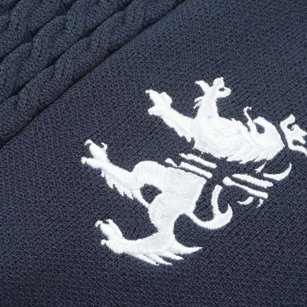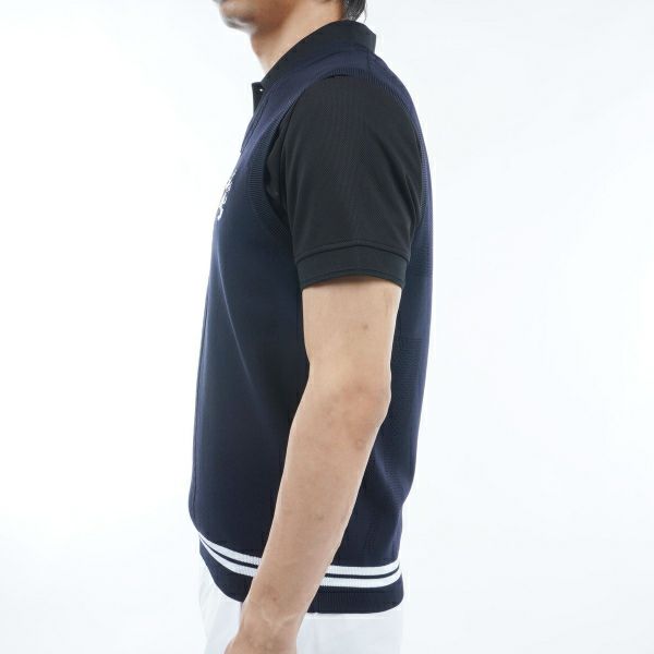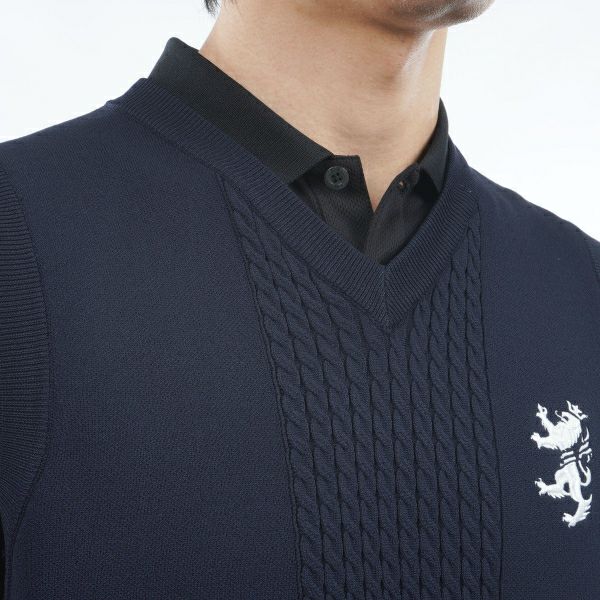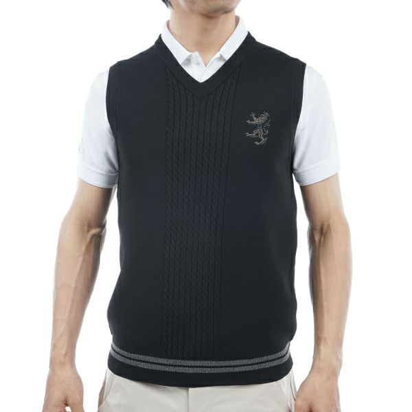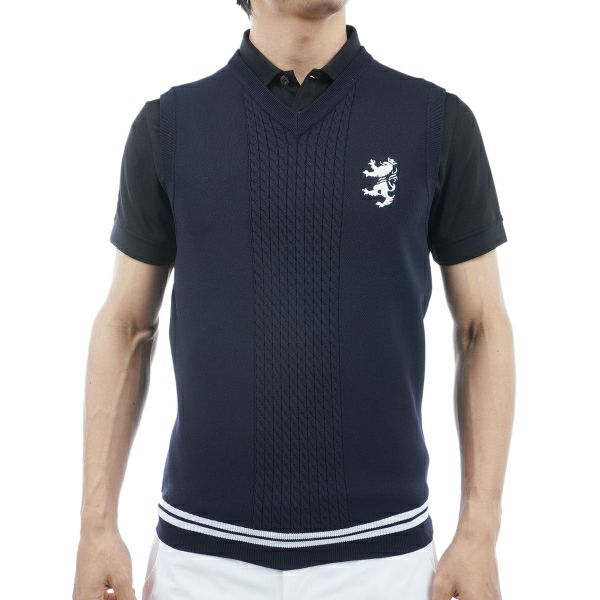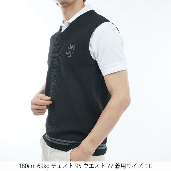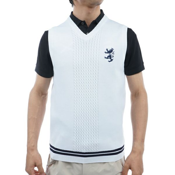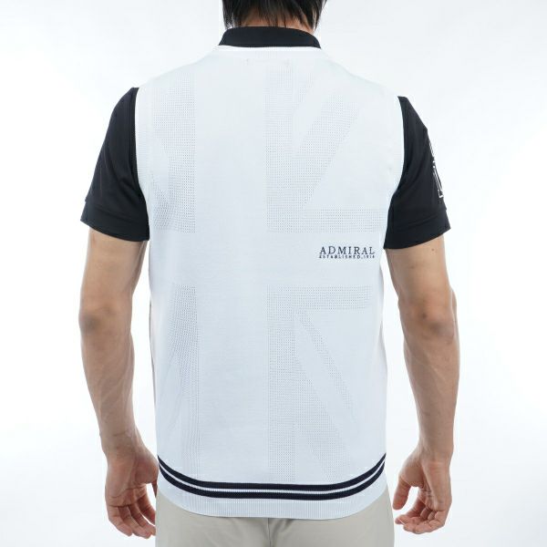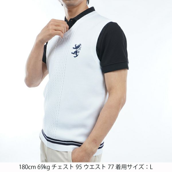 商品説明 イージーケアが嬉しいポリエステル糸を使用したVネックベスト。背中全体に編み地変化で表現したユニオンジャック柄がポイント。裾と衿に入れたラインがクラシックなゴルフスタイルにマッチします。ベストは体温調節がしやすく、スリーブレスでスイングを邪魔しない、1枚着るだけで清潔感を与えてくれるクラシックな万能アイテムです。