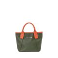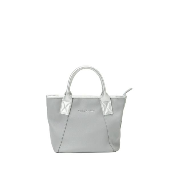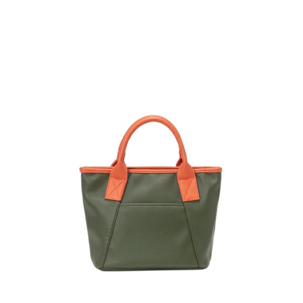 ソフトな合成皮革のラウンドバッグ。タウンでもゴルフでも使えるデザインで、本体と持ち手の配色が特徴です。