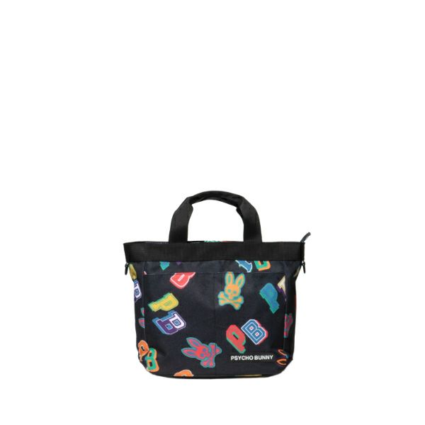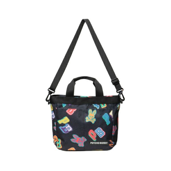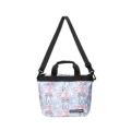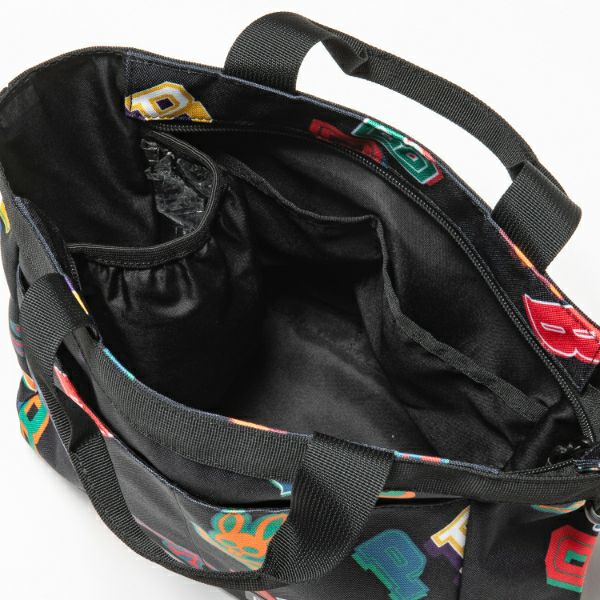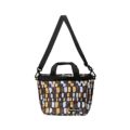 各色ごとに異なった柄を使ったラウントトートバック。内側にはペットボトルを立てて入れることができるポケット付き。2wayで使えるショルダーベルト付き。ポケット数:外3、内3