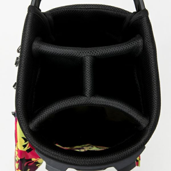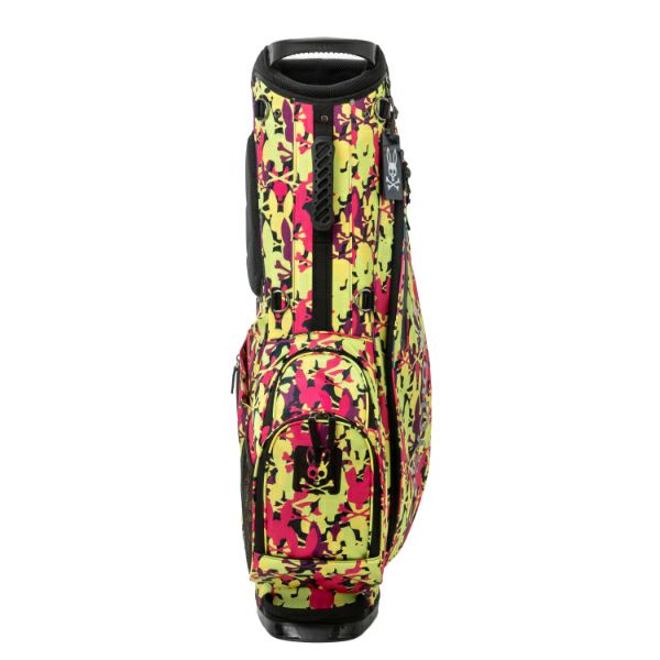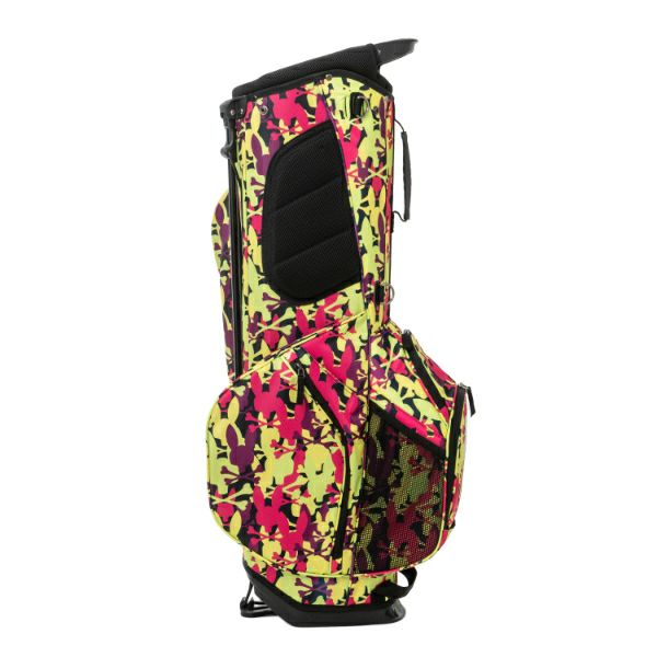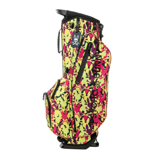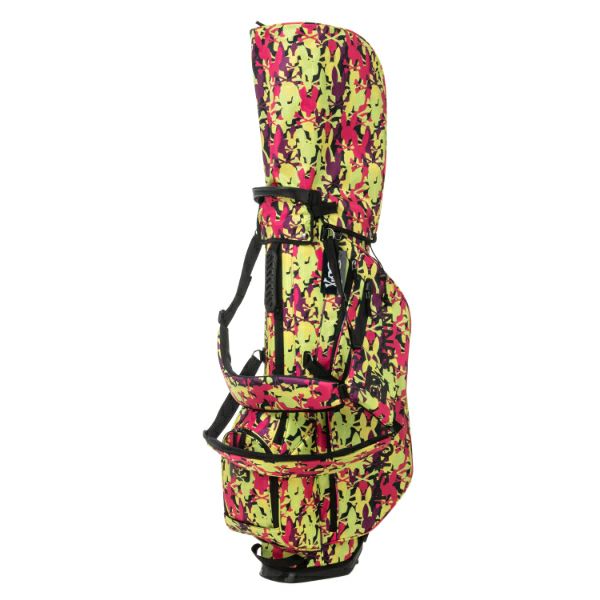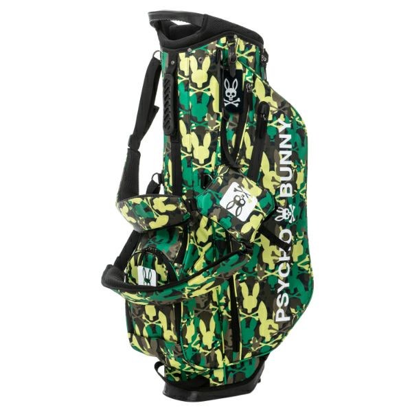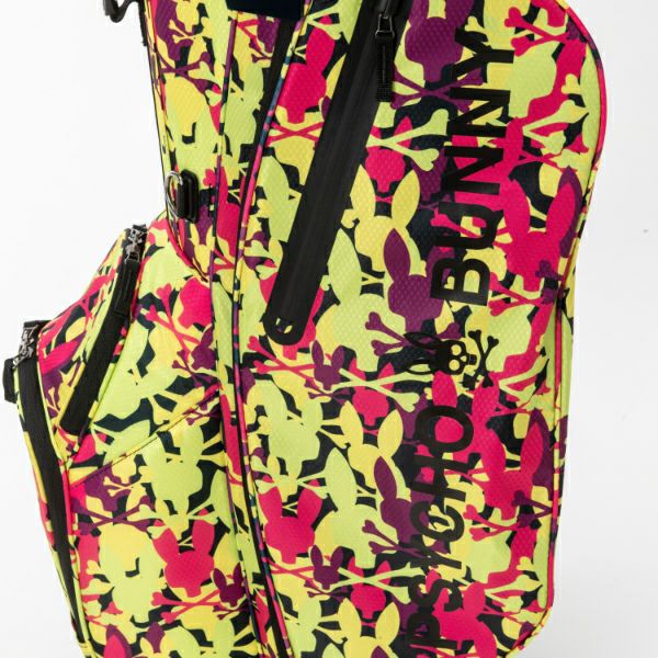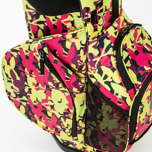 商品説明 カモフラージュをバニーで表現した柄のスタンドキャディバック。軽量で使いやすいバックパックタイプのショルダーベルト付き。ソフトな裏地を使った止水ポケットやシルバー生地を使った保冷ポケット付きで、シンプルな中にも機能性に富んだデザイン。