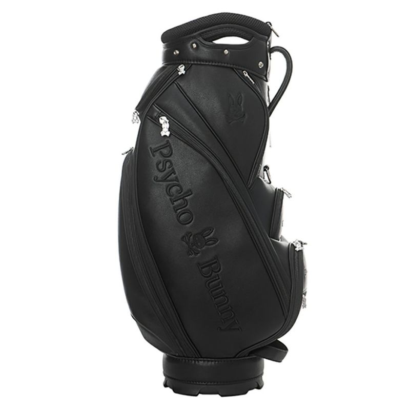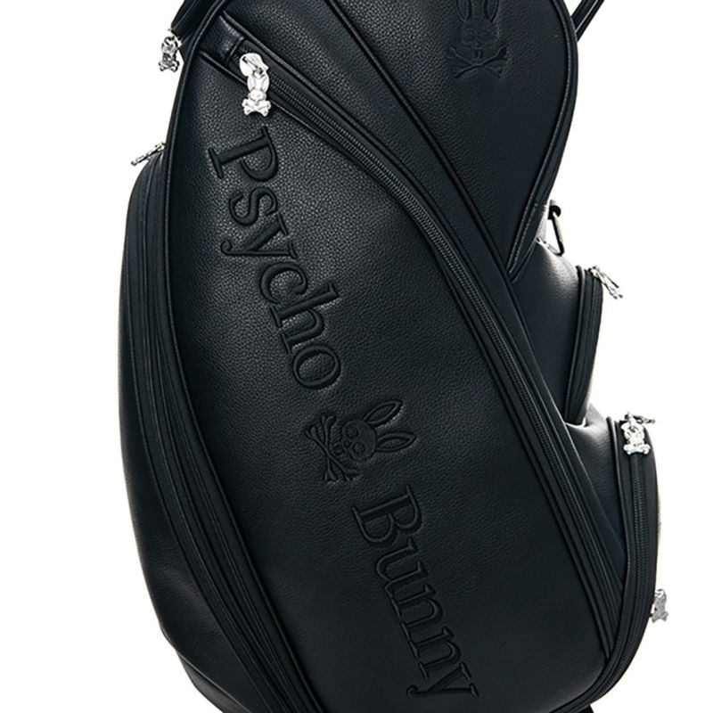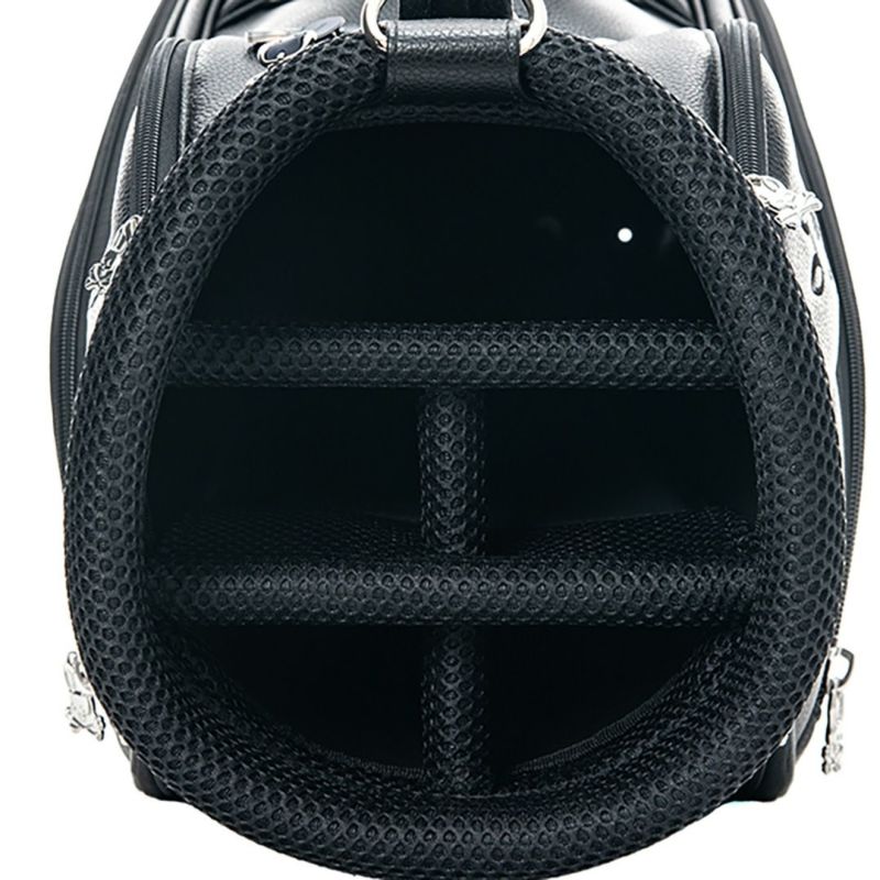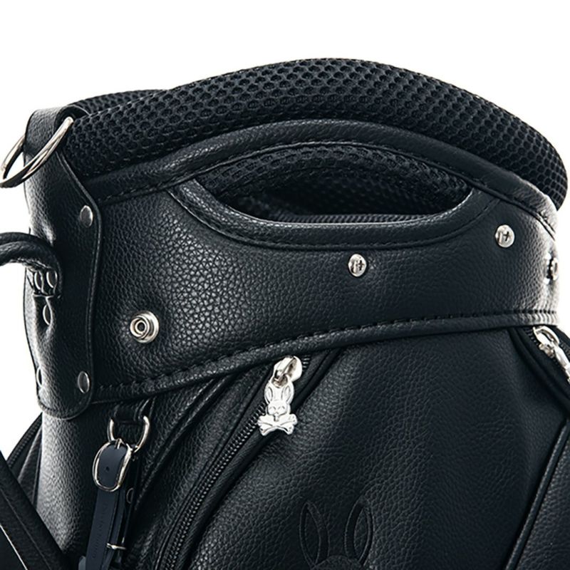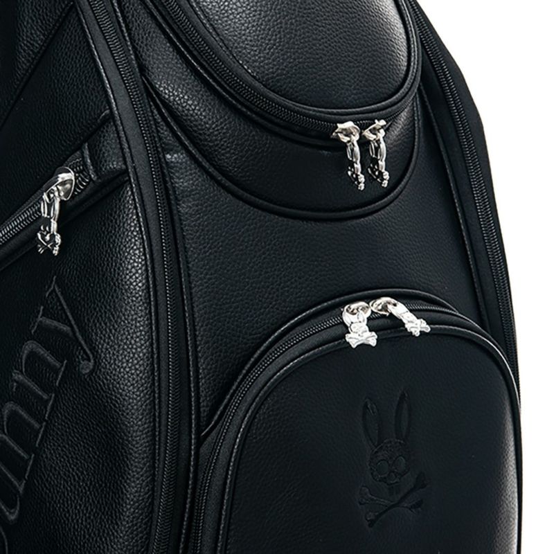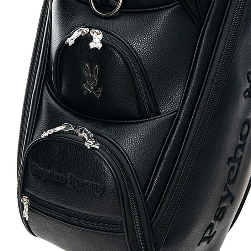 商品説明 高級感ある合成皮革を使用したキャディバッグです。全体を黒で統一し、メタルバニーがアクセントとなっています。側面にはシンプルながらも存在感のある3D刺繍が施されています。口枠は9型で5分割され、セパレーターも装備しています。さらに、ポケットは合計で10箇所装備されており、収納面でも充実しています。高品質な素材と機能性を兼ね備えたキャディバッグで、ゴルフをより快適にサポートします。