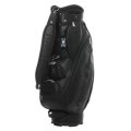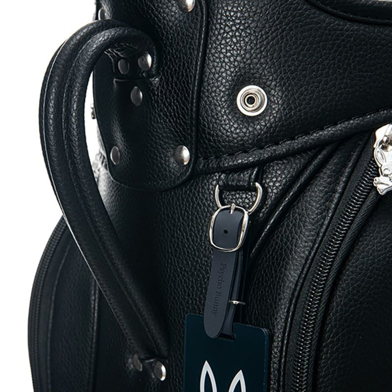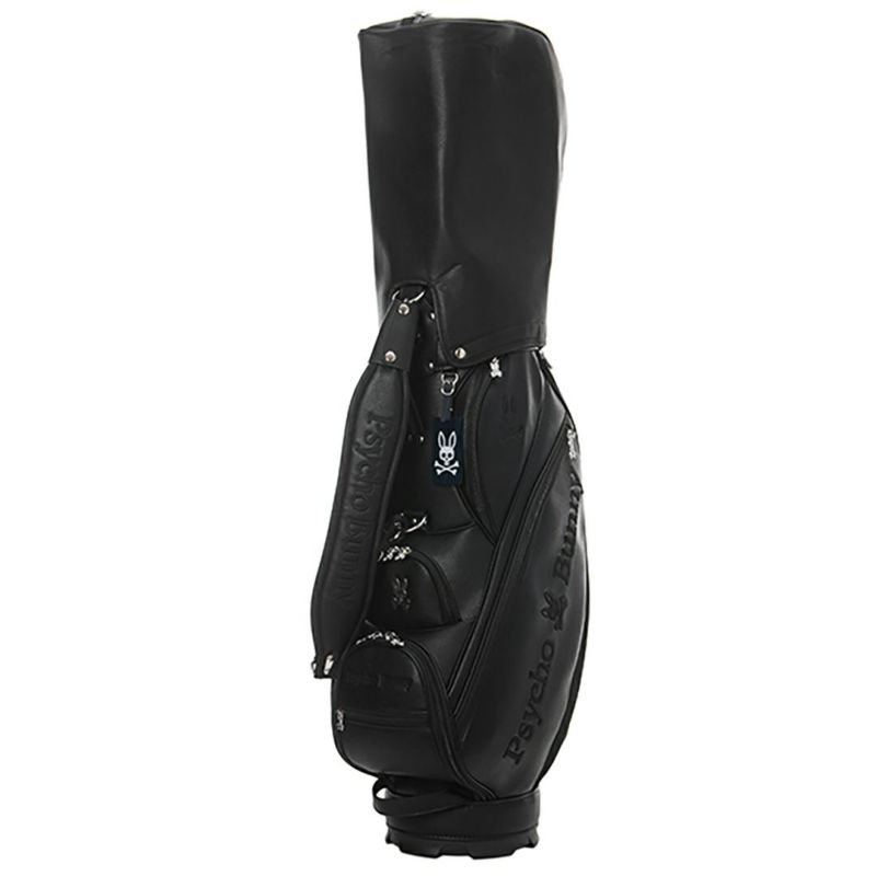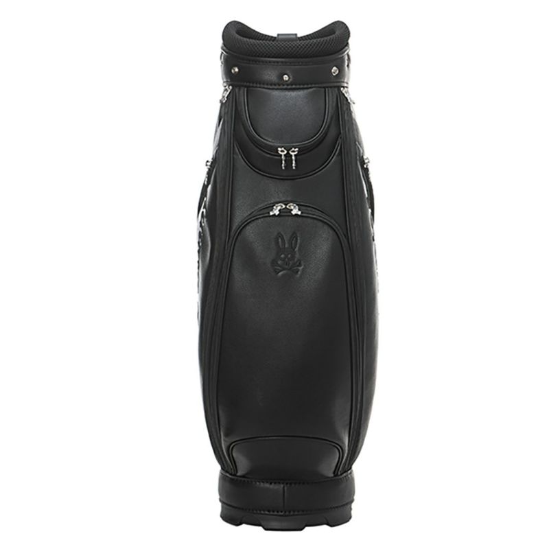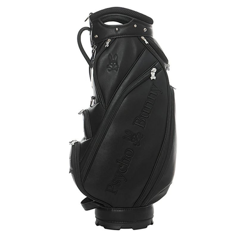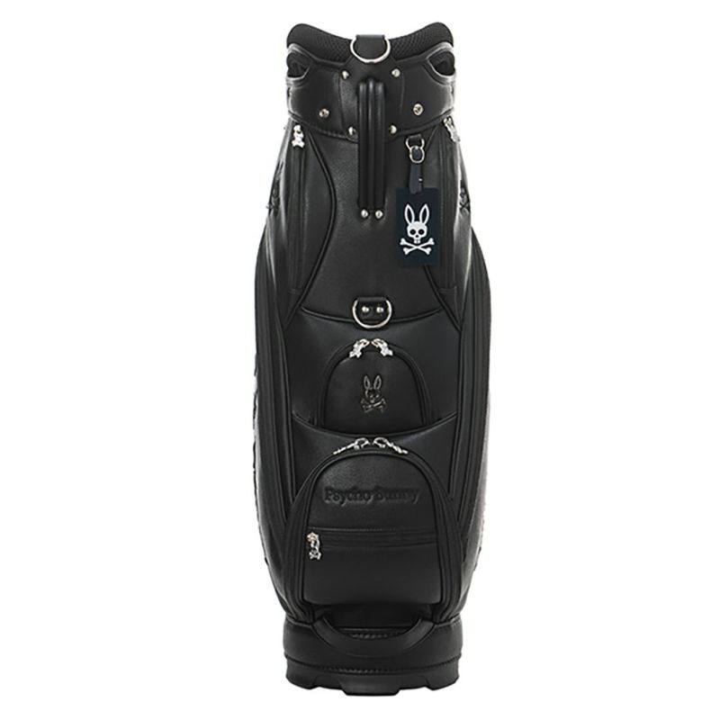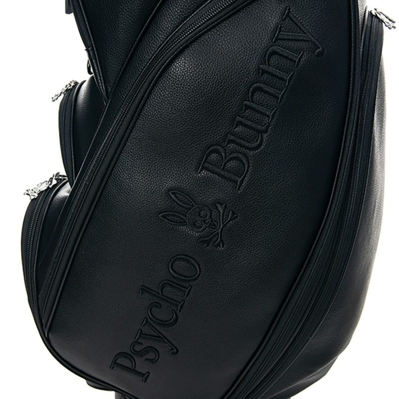 商品説明 高級感ある合成皮革を使用したキャディバッグです。全体を黒で統一し、メタルバニーがアクセントとなっています。側面にはシンプルながらも存在感のある3D刺繍が施されています。口枠は9型で5分割され、セパレーターも装備しています。さらに、ポケットは合計で10箇所装備されており、収納面でも充実しています。高品質な素材と機能性を兼ね備えたキャディバッグで、ゴルフをより快適にサポートします。