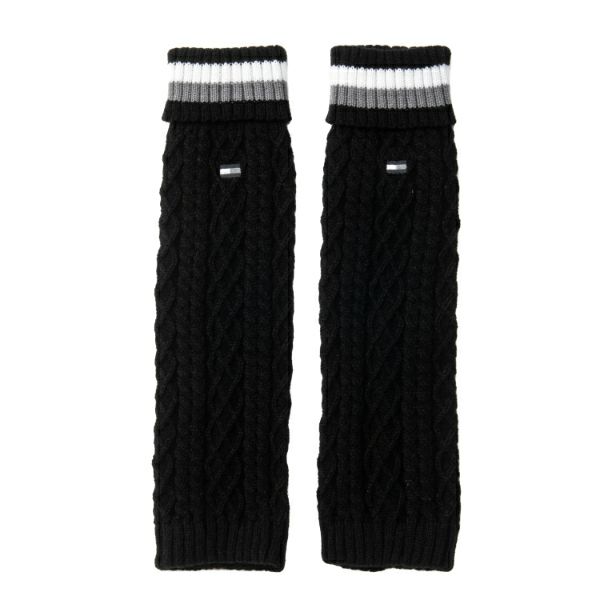 フラッグがアクセントとなった、ローゲージのケーブル編みレッグウォーマー。冬のプレーに必須な防寒アイテム。