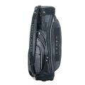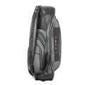 商品説明 レザー調生地に風合いのある色の合皮を組み合わせたキャディバッグ。カジュアルな中にも高級感が漂い、前面には4つのポケット、背面にも収納スペースが装備されています。3点式ショルダーストラップと、ステッチのアクセントカラーが特徴で、特別ネームプレートも付いています。口枠5分割、セパレーター数3分割。
