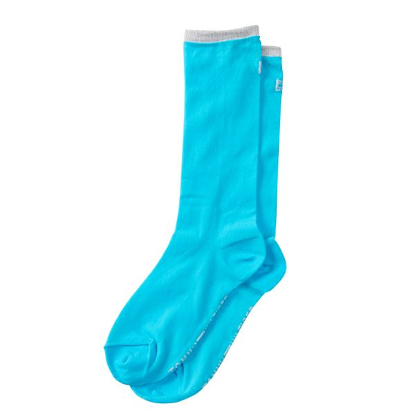 コーディネートのアクセントになるカラーシアーソックス。ロゴとリブに銀糸を施し、女性らしさを演出。