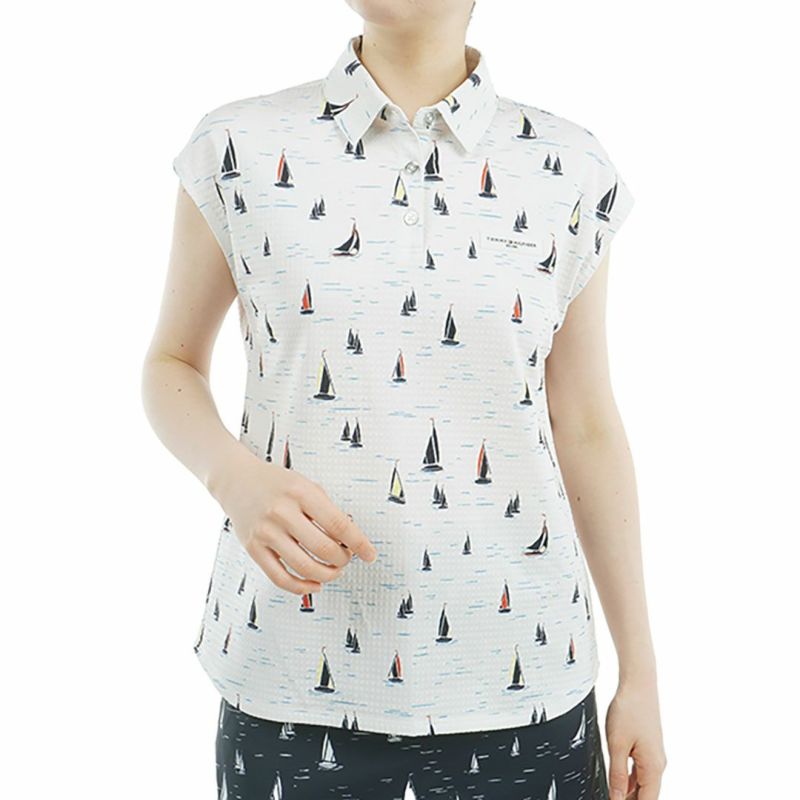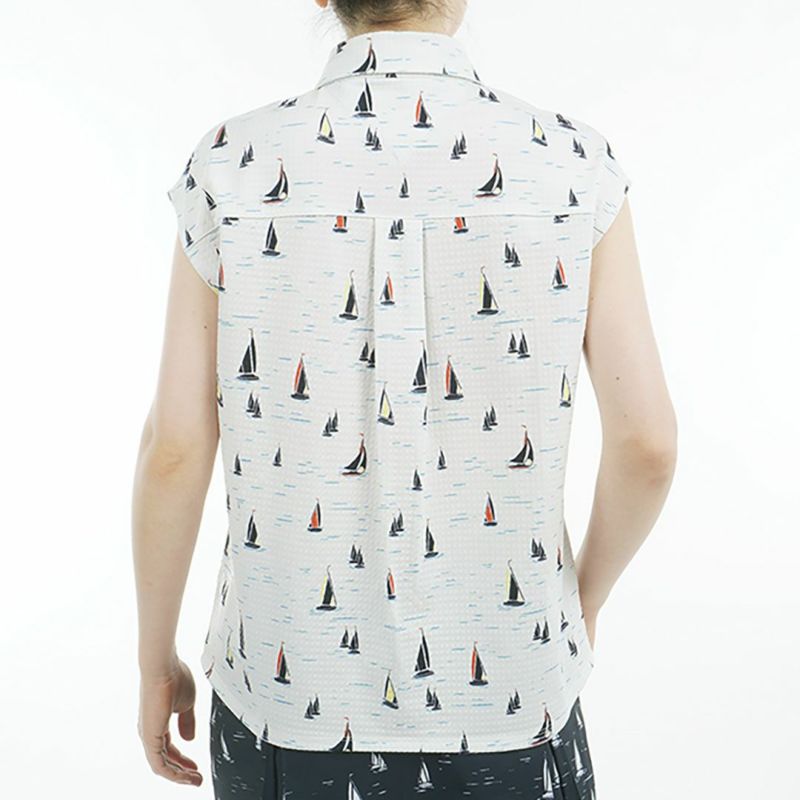 商品説明 UVカット機能を備えた柔らかいジャージー素材を使用した、フレンチスリーブシャツ。 特徴的なサッカー調のしぼ感が、シンプルでありながら上品な印象を与えます。セーリングをイメージしたヨット柄で、アクセントとしてミラーボタンが施されています。 肩を隠せるフレンチスリーブは、縦長のラインを強調し、スタイルを良く見せます。背中のタックとゆったりとしたサイズ感により、肌離れを配慮し、快適な着心地が提供されます。 暑い夏にノースリーブには抵抗のある方へ、おすすめの一枚です。 同柄のスカートとセットアップコーデもお勧めです。メーカー品番:THLA520
