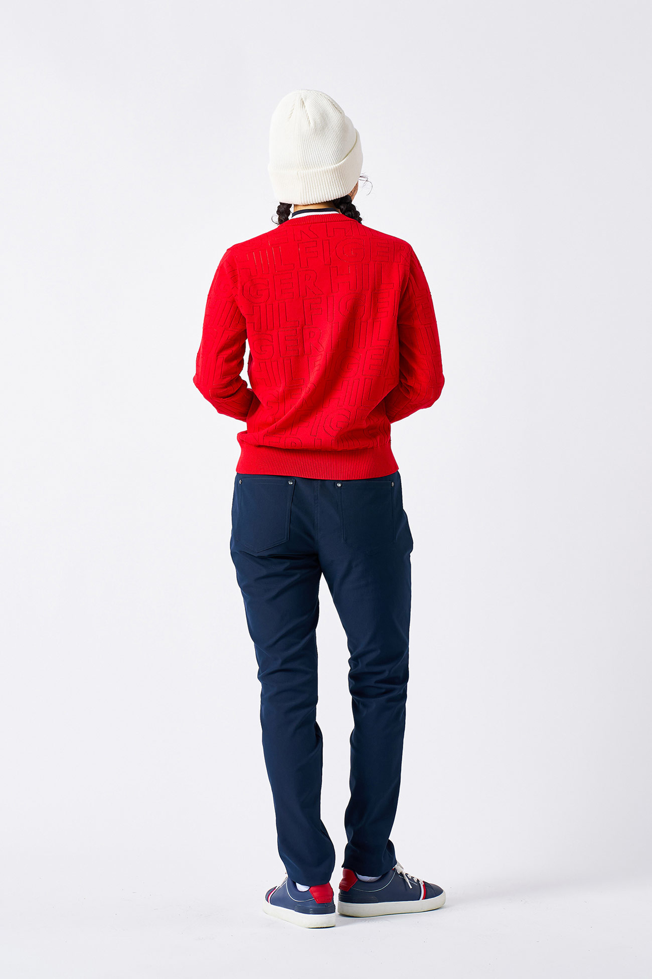 ブランドロゴをアイレットメッシュで表現した無地ライクなニットと、トップスを選ばない定番パンツのコーディネート。シンプルでありながらも品よく、アクティブな着こなしに。
