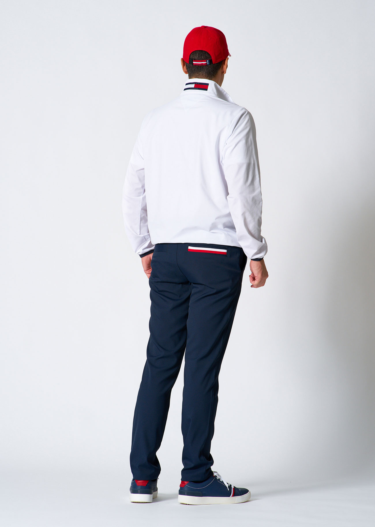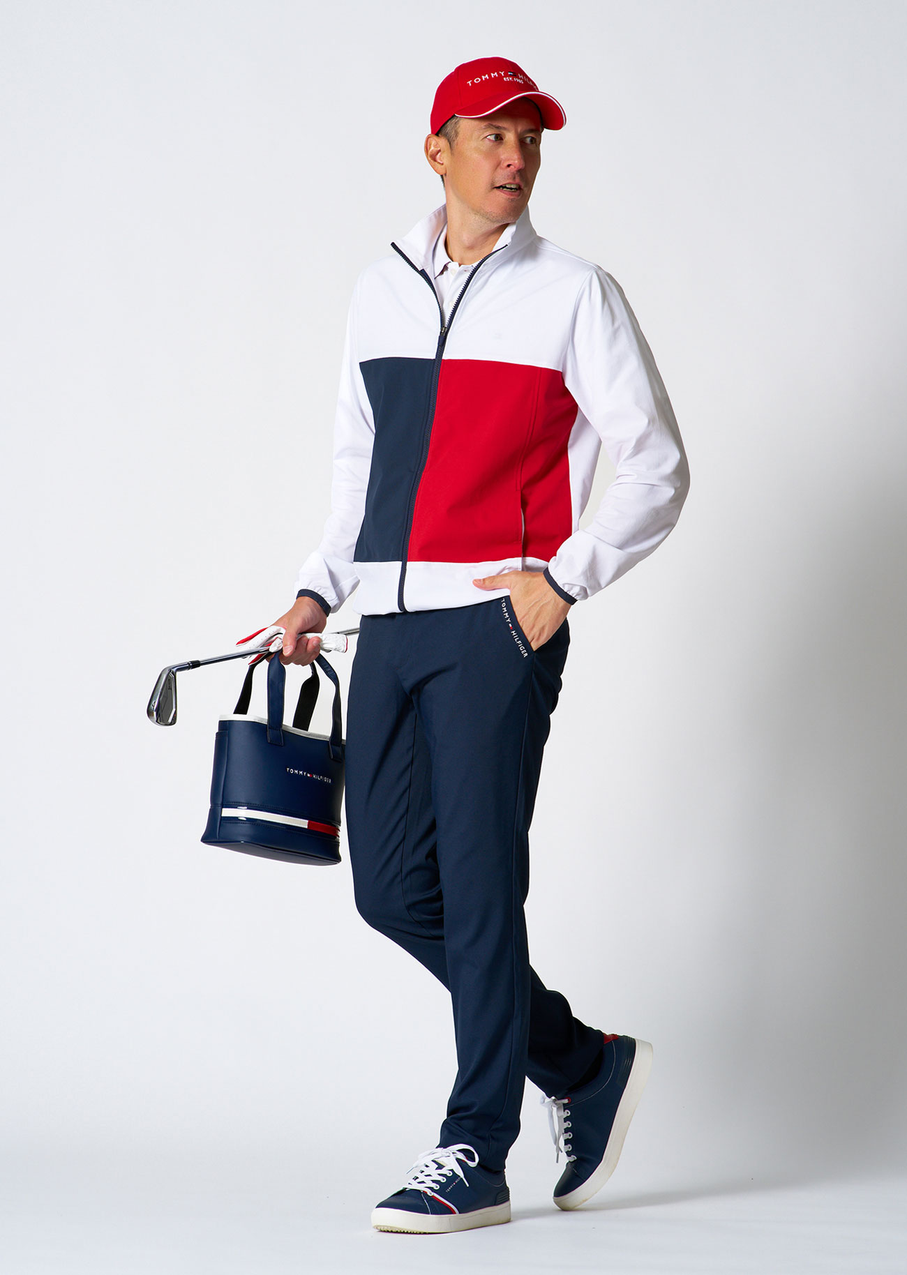 防風性を備え、布帛のような軽い着心地のウィンドジャケットに、ストレッチ性に優れたパンツのコーディネート。フラッグをイメージしたカラーブロックを主役に、全身でブランドカラーを表現。