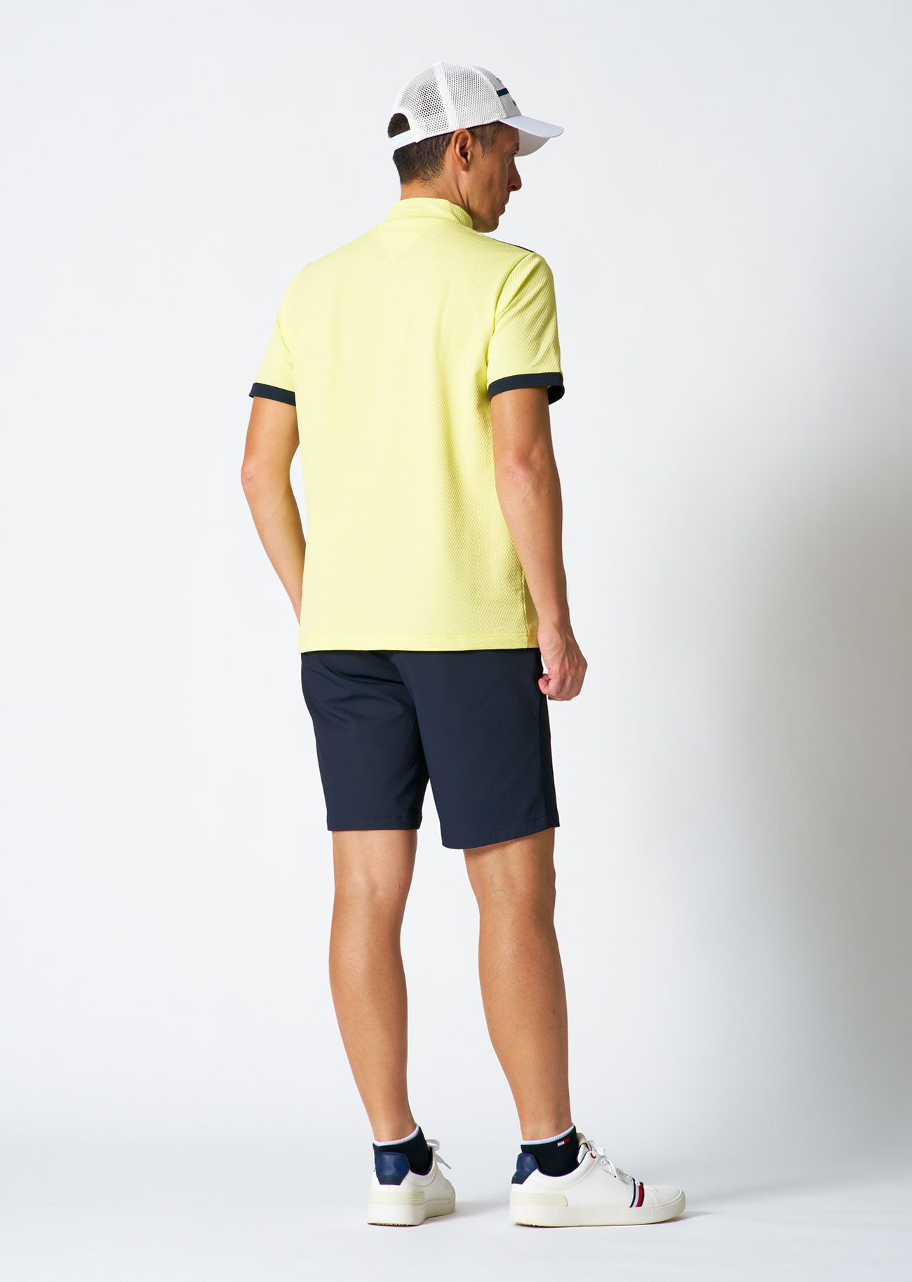 肌離れの良いサッカー調素材の半袖モックシャツに、遮熱パンツを合わせたコーディネート。クラシカルなロゴが映えるライムグリーン×ネイビーの組み合わせで、爽やかな印象に。
