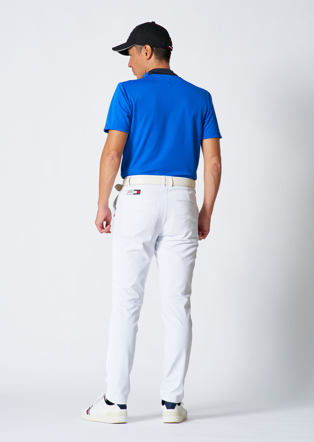 接触冷感素材のポロシャツに、遮熱パンツを合わせたコーディネート。ロゴプリントとTシャツ感覚で着られるデザインが程よくカジュアルで、ラフすぎない大人のスタイル。