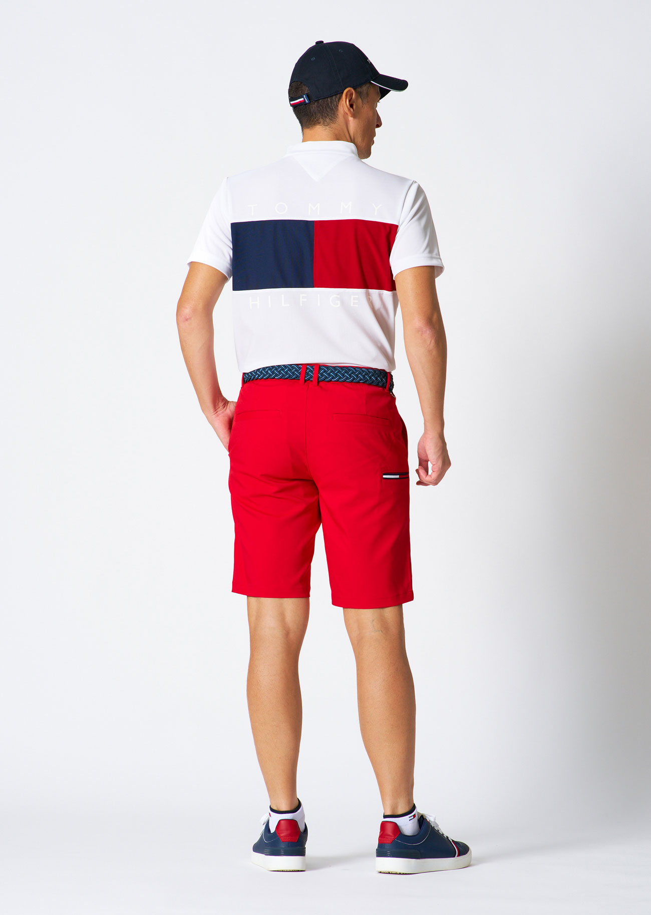 接触冷感素材の半袖シャツに、ストレッチ性に優れたショートパンツを合わせたコーディネート。フロントはミニマル、バックは大胆なフラッグで、前後で表情の変わるインパクトあるスタイル。