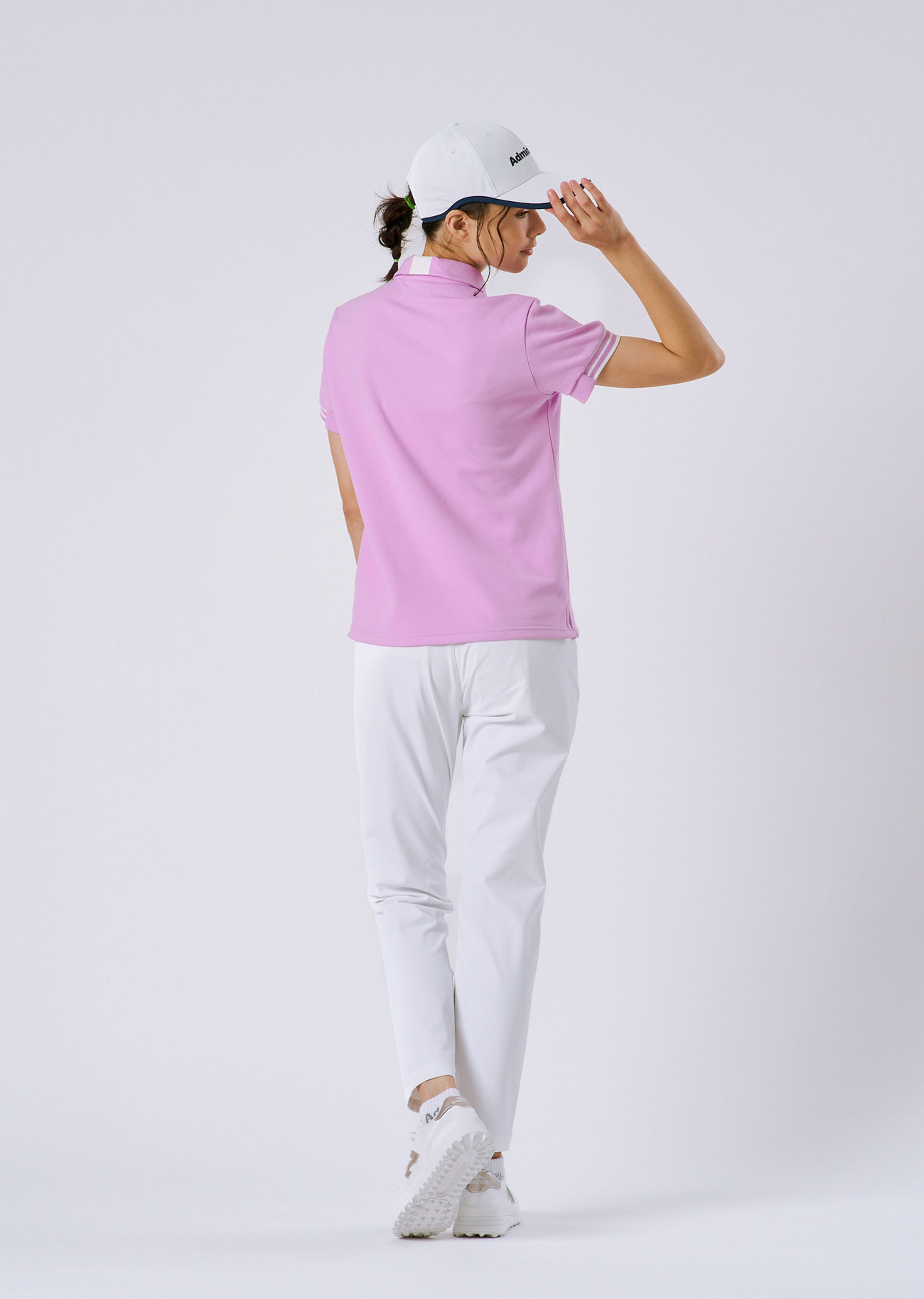 快適な着心地が続くカラタッチポロに、透けにくいストレッチパンツを合わせたコーディネート。華やかなパープルと、9分丈パンツの軽やかさで上品な印象に。