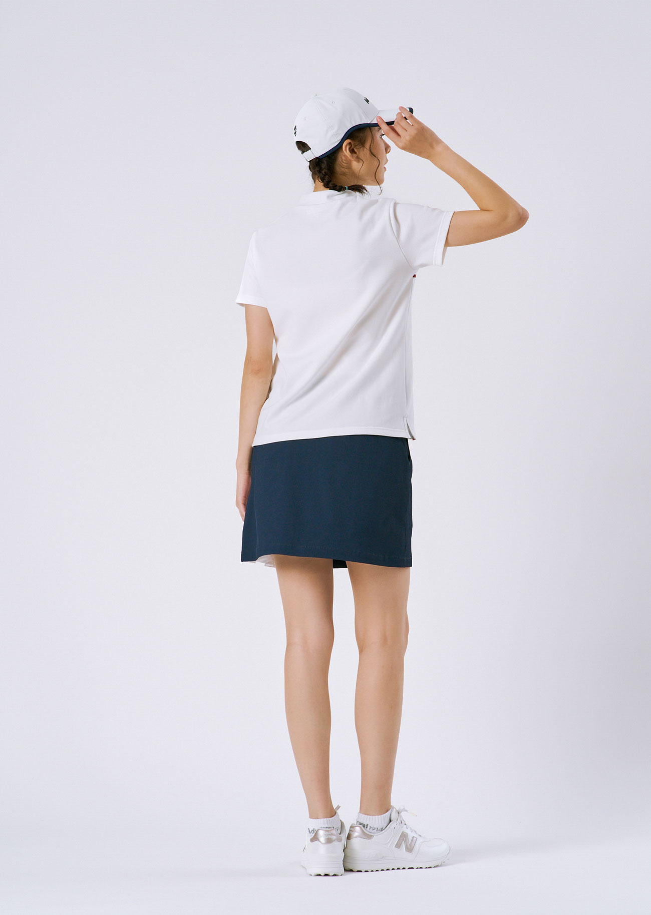 快適な着心地が続くカラタッチシャツに、透けにくいストレッチスカートを合わせたコーディネート。王道配色でシンプルながら、素材や機能は進化で新鮮な印象に。