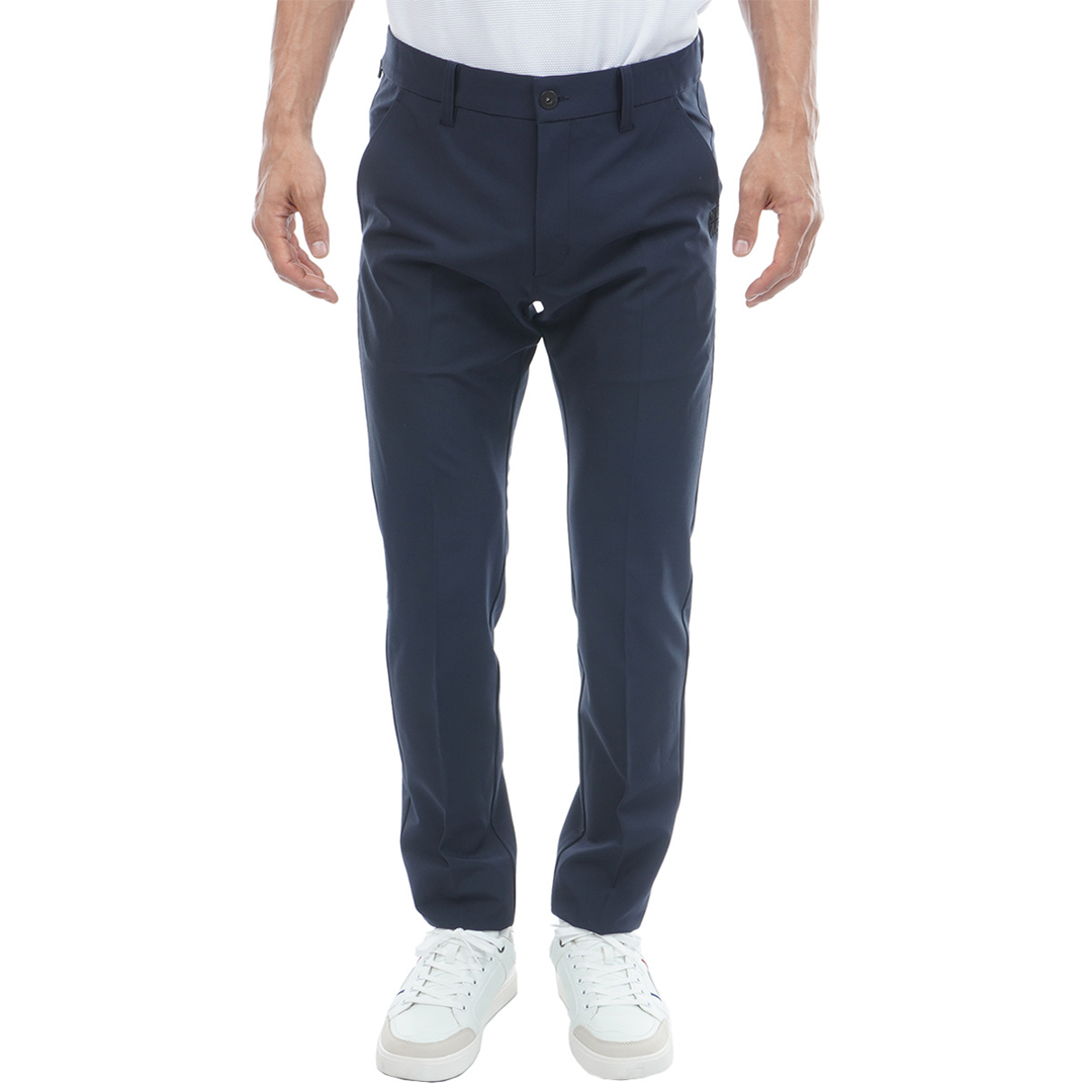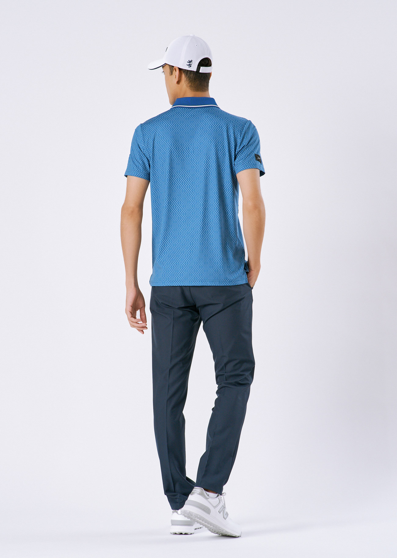 ディープブルーの小紋柄ポロに、4WAYストレッチのロングパンツを合わせたコーディネート。総柄でも派手すぎず、ネイビーのパンツでバランスよくまとめた着こなし。