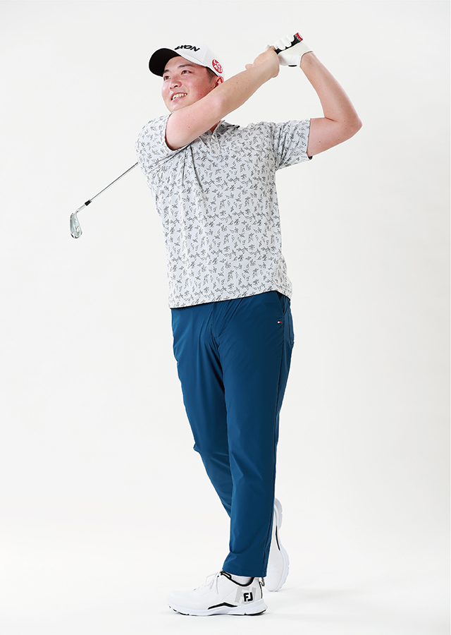 国産ジャカード生地で筆記体ロゴを配したポロシャツに、軽量で清涼感のあるパンツのコーディネート。華やかな柄に深みのあるブルーを合わせ、すっきりと爽やかな印象に。