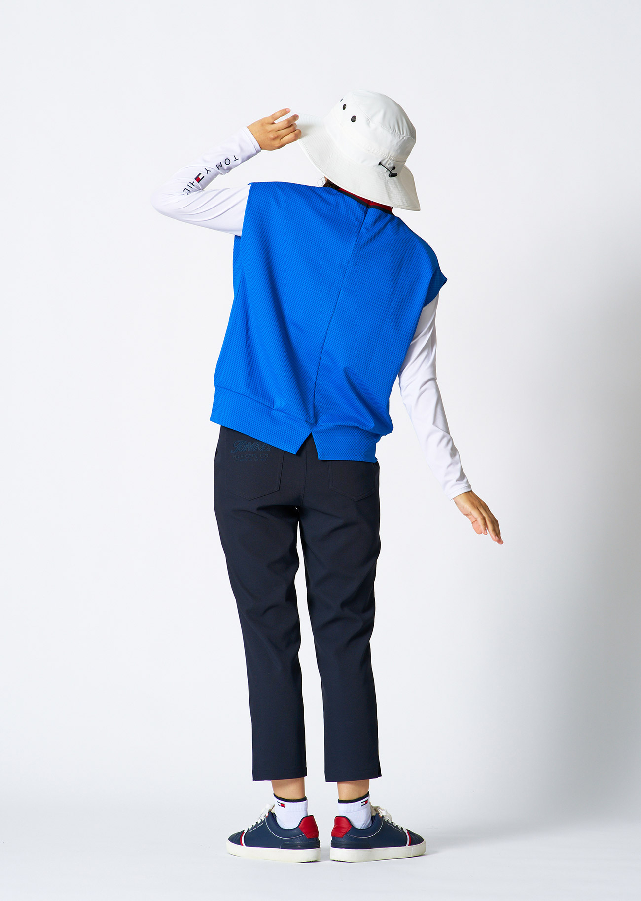 肌離れの良いサッカー調のポロシャツに、軽くストレッチ性のあるパンツを合わせたコーディネート。白のインナーを覗かせ、ブルー×ネイビーを軽やかにまとめた上品なスタイル。