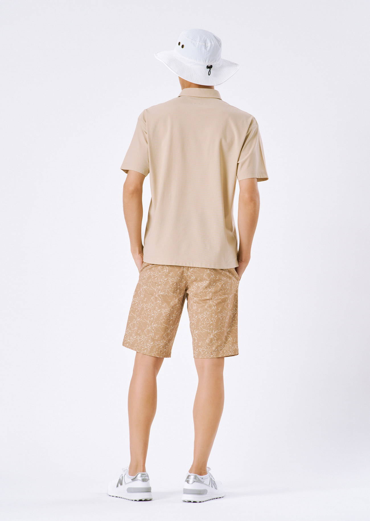 細かなドット状のメッシュが涼しげなシャツに、リーフ柄のショートパンツを合わせたコーディネート。アースカラーでまとめ、無地と柄の対比が上品に映えるリラックススタイル。