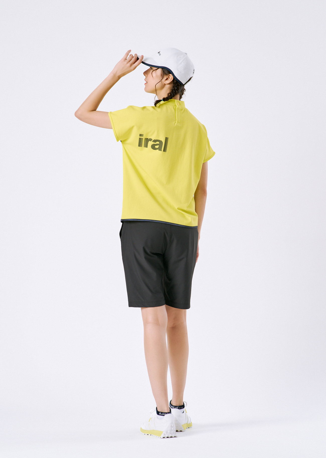 肌離れの良いドライタッチカノコ素材のポロシャツに、冷感性の高いハーブパンツを合わせたコーディネート。イエローとブラックのコントラストが映える、メリハリのあるスポーティースタイル。
