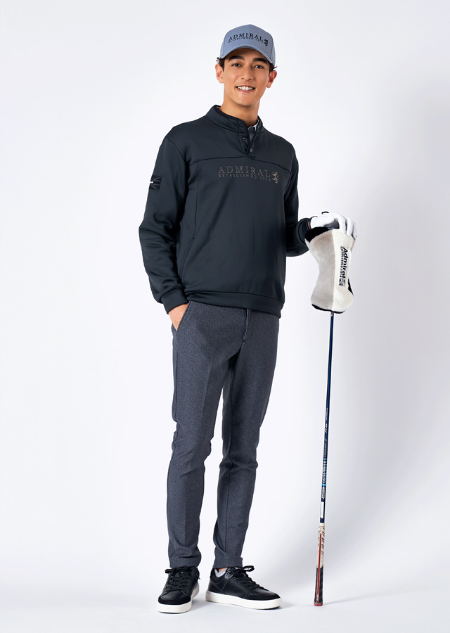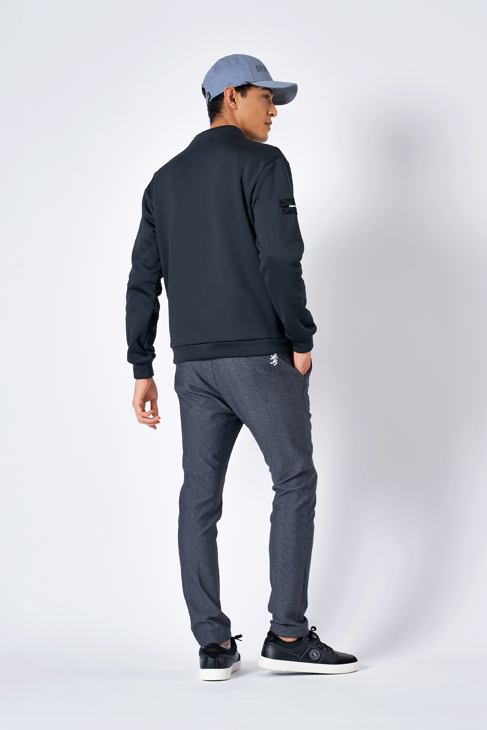 上品な光沢感と耐摩耗性に優れたカルイシ素材のスウェットと、360度ストレッチの効くパンツのスポーティーコーデ。スウェットは肉厚なのに軽くて暖かく、アクティブに動きたい人にオススメ。