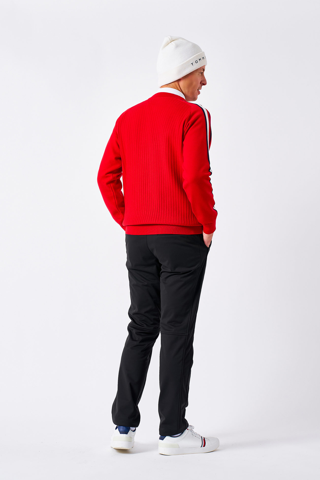 裏起毛&高ストレッチのシャツに、袖のシグネチャーストライプがアクセントのニットをレイヤード。裏フリースの3層ボンディングパンツを合わせ、冬に映えるクラシカルなスタイルに。