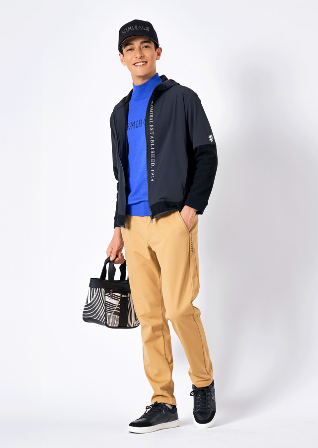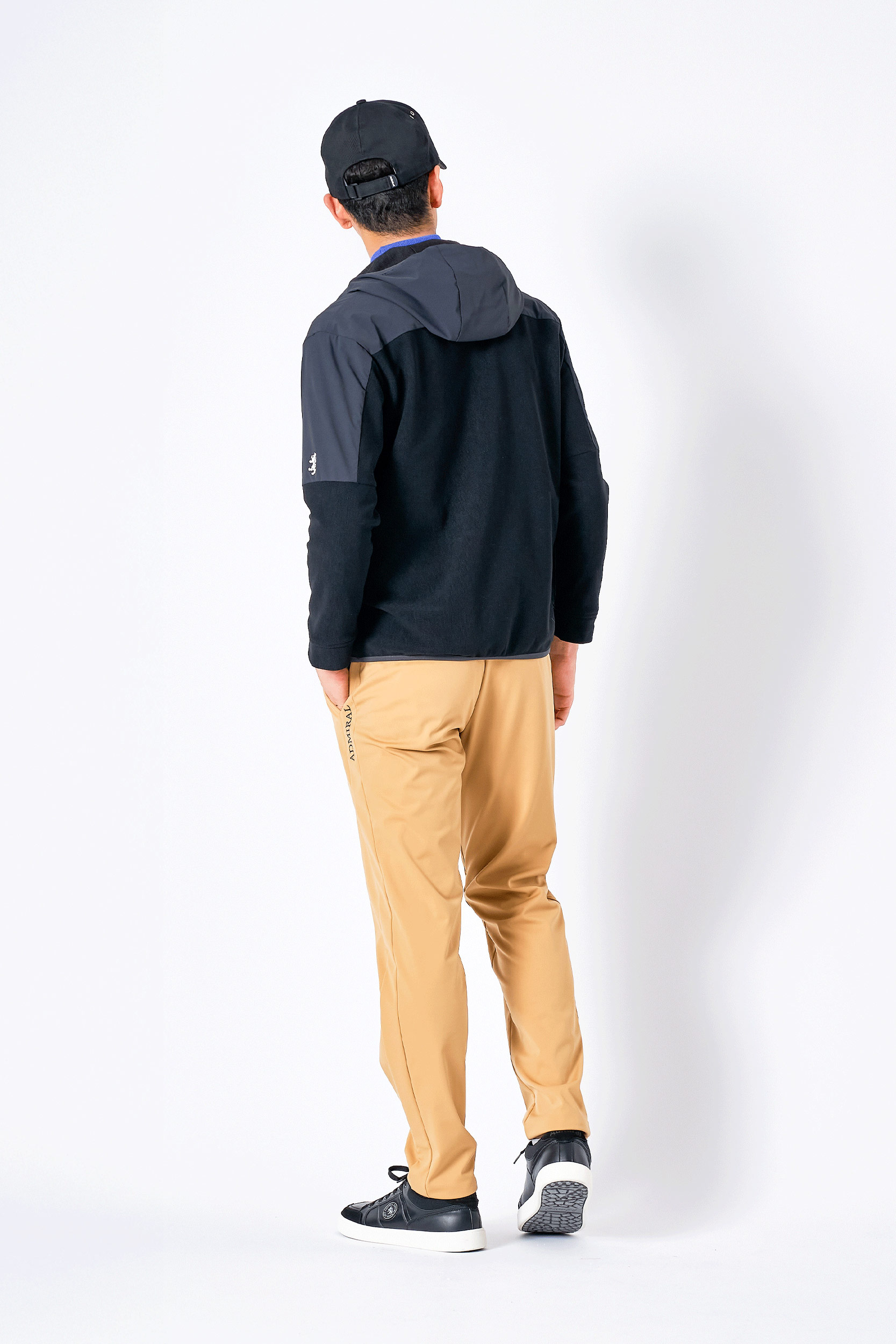 今季イチオシする機能素材”ホカタッチ”ニットに、ハイブリッドなフーディーをレイヤード。防風パンツを合わせ、カジュアルな色合いと素材のぬくもりを感じるスタイル。