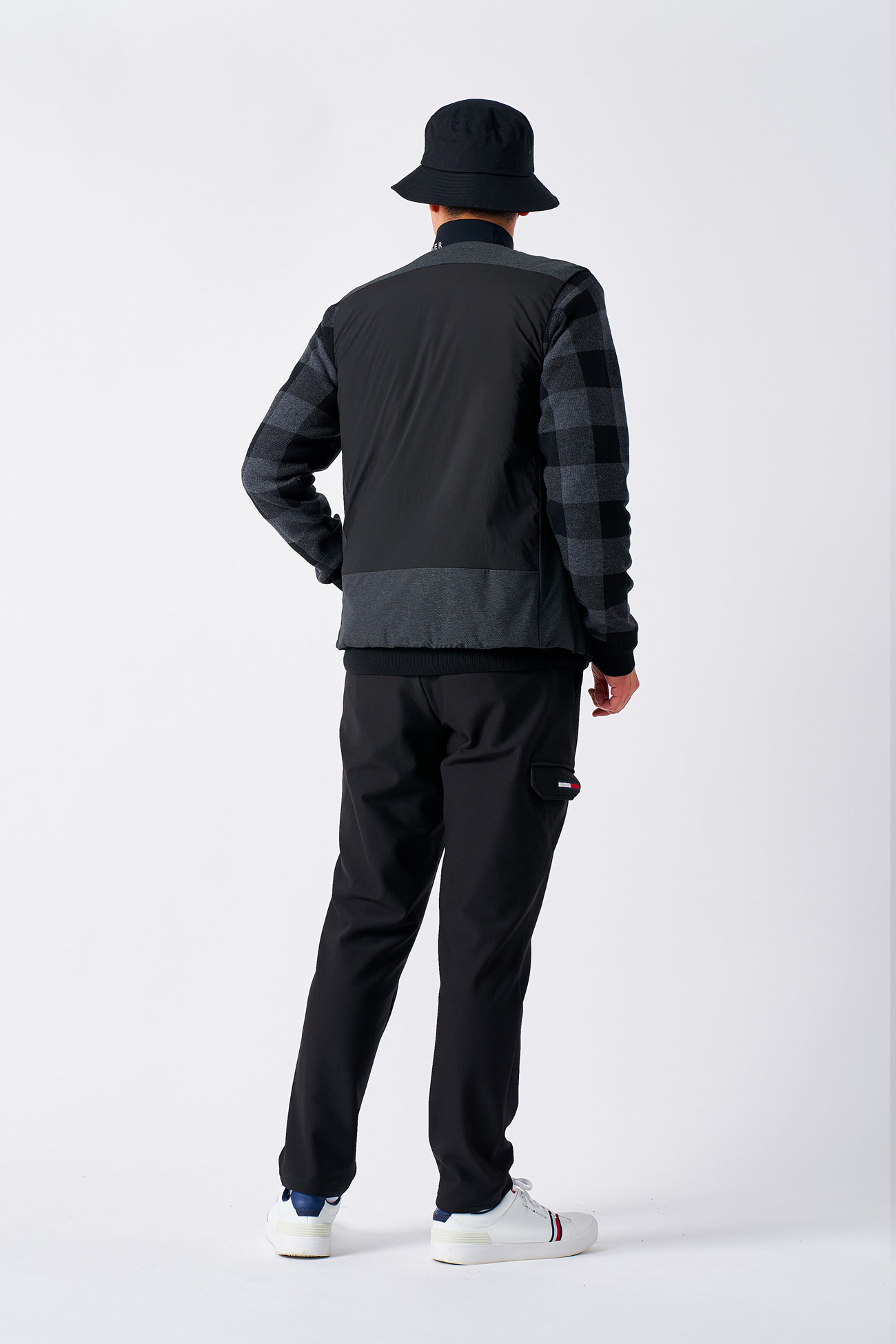 右肩のシグネチャーストライプがアクセントのニットと、裏起毛フリースパンツの冬コーデ。体温調節に役立つノーカラーの中綿ベストと、裏起毛シャツで防寒対策も万全なクラシカルスタイル。