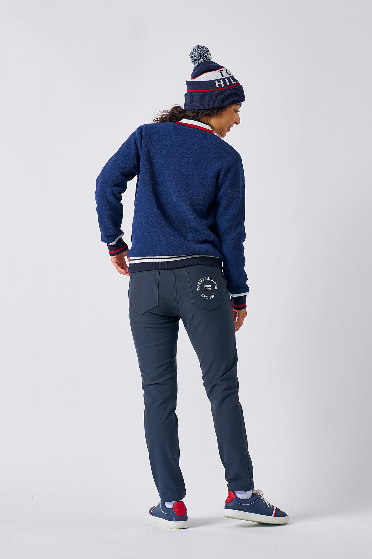 エンブレム刺繍とストライプが映える表面と、大胆な配色切り替えの裏面。二つの表情を楽しめるジャケットに、ロゴ入りシャツと裏フリース起毛パンツを合わせたスタイル。