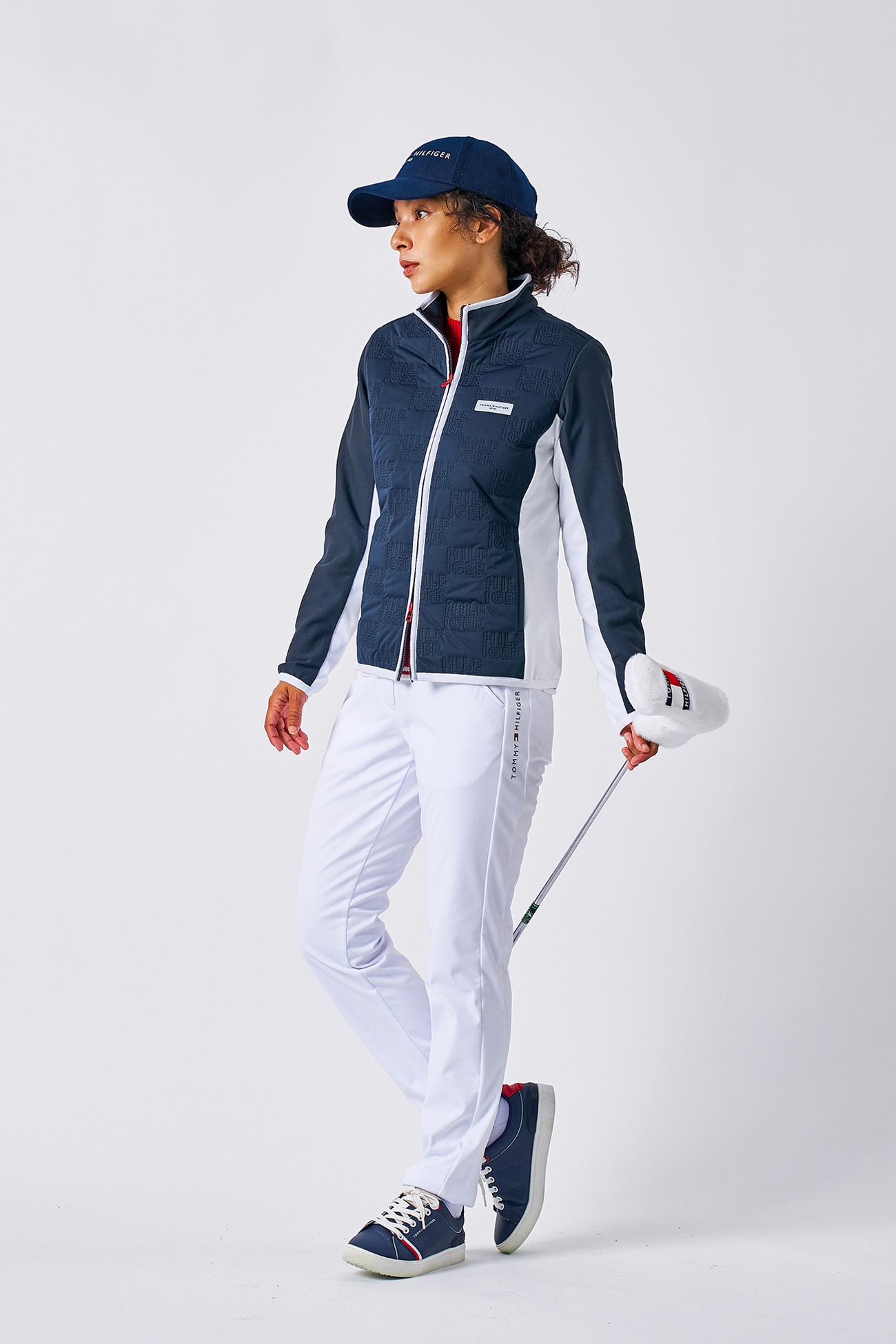 ロゴを全面にエンボス加工で表現したキルトレスジャケットと、裏フリースの3層ボンディングパンツのコーディネート。アウターは優れたストレッチ性で、着たままプレーもオススメ。