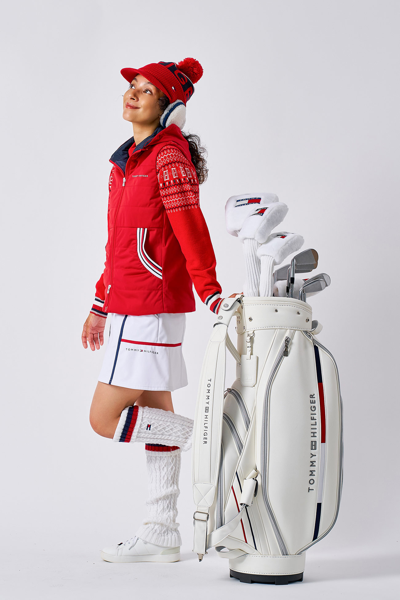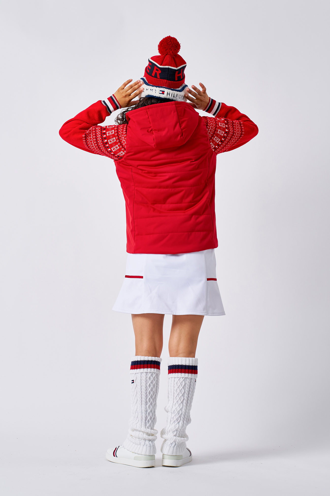 フラッグを組み合わせたオリジナルのフェアアイル柄とラメ糸が特長のニットに、中綿ベストを重ね、裏フリースの3層ボンディングスカートで赤と白を効かせたクラシカルな着こなし。