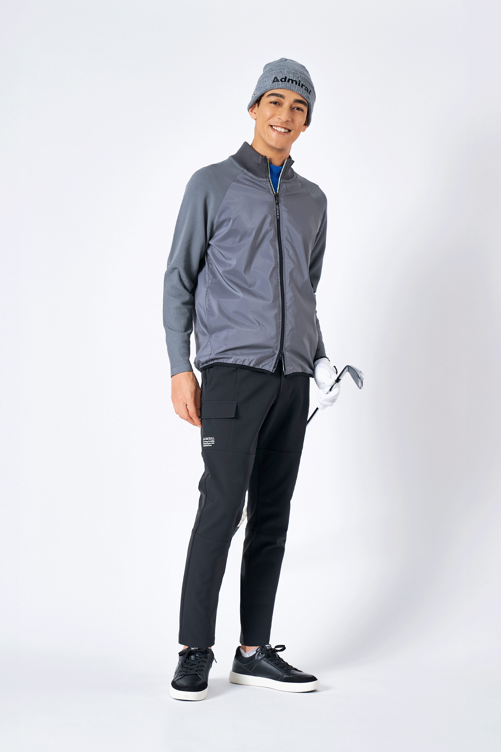 軽量感とイージーケア性が魅力のジャケットと、凹凸感のあるワッフルストレッチ素材を使用したパンツのコーディネート。グレー×黒で表現した大人ならではの柔らかいモノトーンスタイルに。