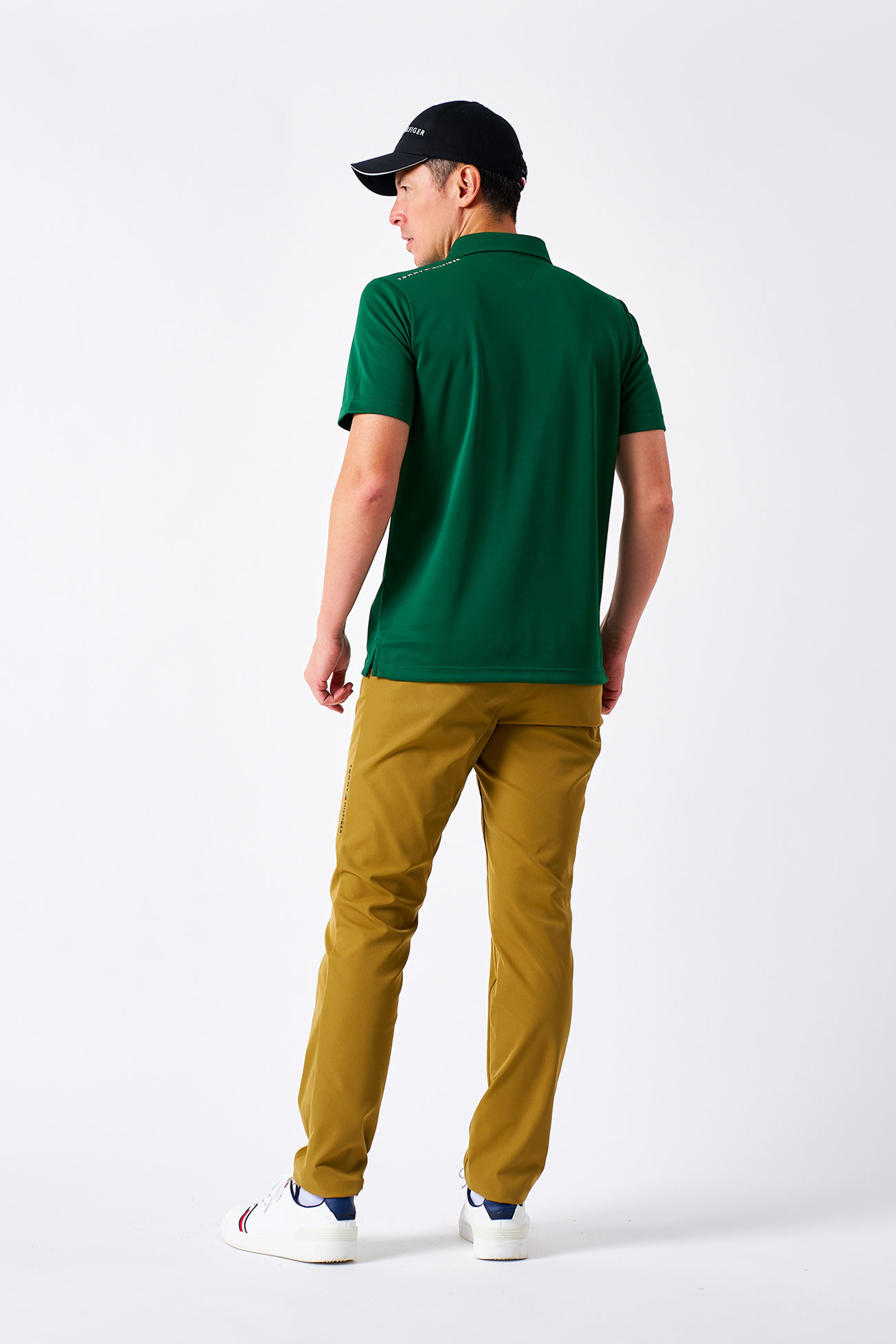 リサイクルポリエステル×鹿の子生地の定番ポロシャツコーデ。シワになりにくいポリエステルツイル素材のパンツを合わせ、秋を感じさせるカラーリングがいつものコーデを新鮮に。