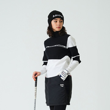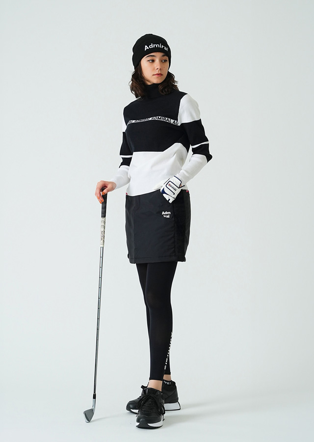 こだわりニットのモードな冬コーデ。柔らかくて暖かい「#HOTRAY」素材のニットは身頃に程よいゆとりを持たせつつ、袖はストレッチ性のあるリブ編みで表現。冬ゴルフにぴったりな軽量の中綿スカートを合わせて。