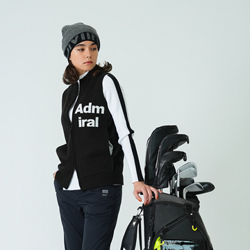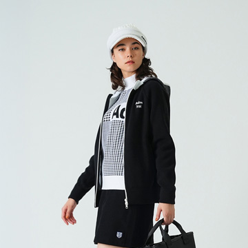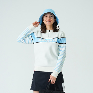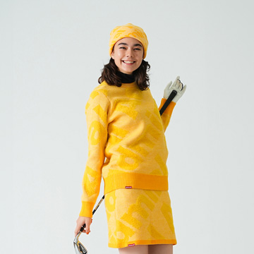 華やぎあふれるイエローのセットアップコーデ。毛足のあるフェザーヤーンを使用し、トーンオントーンでロゴを表現した無地ライクなデザイン。冬ゴルフにぴったりな肉厚のニットで暖かい着こなしに。