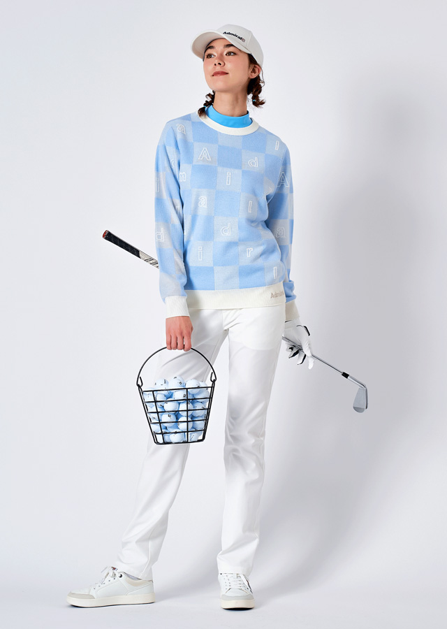遠赤外線を放出するホットレイを使用したニットと、360度ストレッチの効くキュロットのコーディネート。インナーは国産ジャカード生地のシャツを合わせ、明るい配色で顔周りを華やかに。
