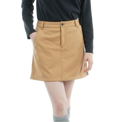 上品な光沢感と耐摩耗性に優れたカルイシ素材のスウェットと、裏フリースのボンディングスカートのコーディネート。スウェットは肉厚なのに軽くて暖かく、アクティブに動きたい人にオススメ。
