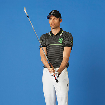 素材と機能性にこだわった無地ライクなコーディネート。ポロシャツはロゴをジャガード編みで表現し、軽量感とサラサラしたドライ感のある清涼生地を使用。チェック柄のパンツは光沢のある素材感と高級感がオススメ。
