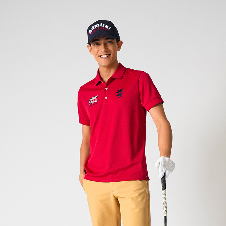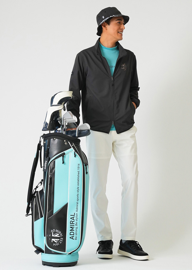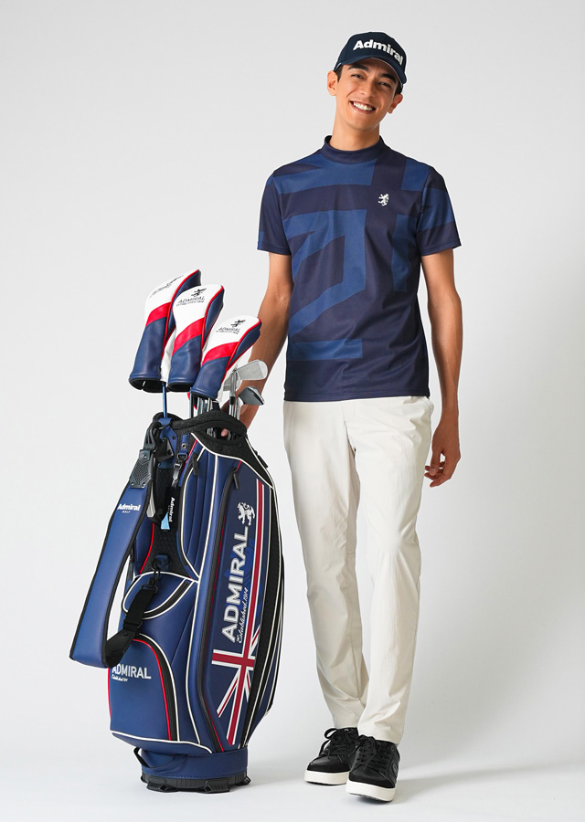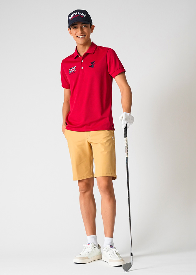 ブランドルーツのユニオンジャック柄シャツに、足さばきの良いパンツのコーディネート。吸水速乾性に優れたシャツに、ヒップ周りにゆとりを持たせたパンツを合わせて。ストレスフリーな着心地がプレーを快適に。
