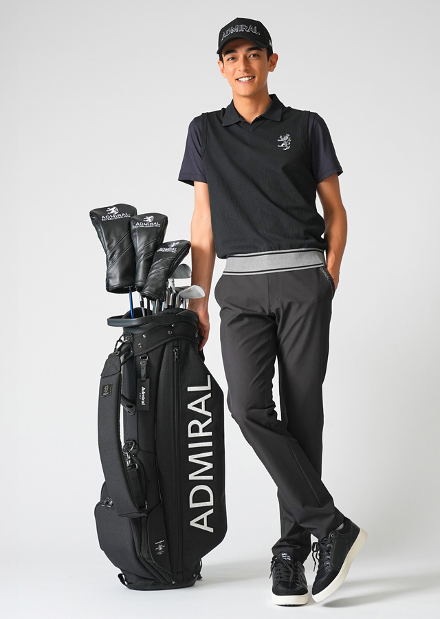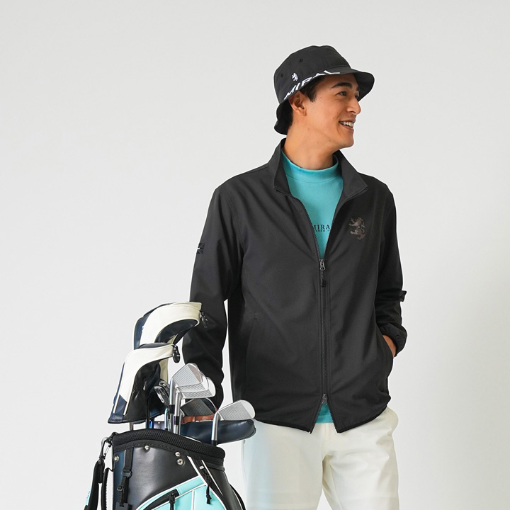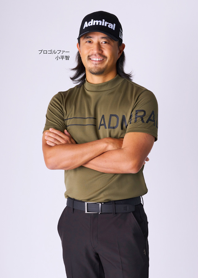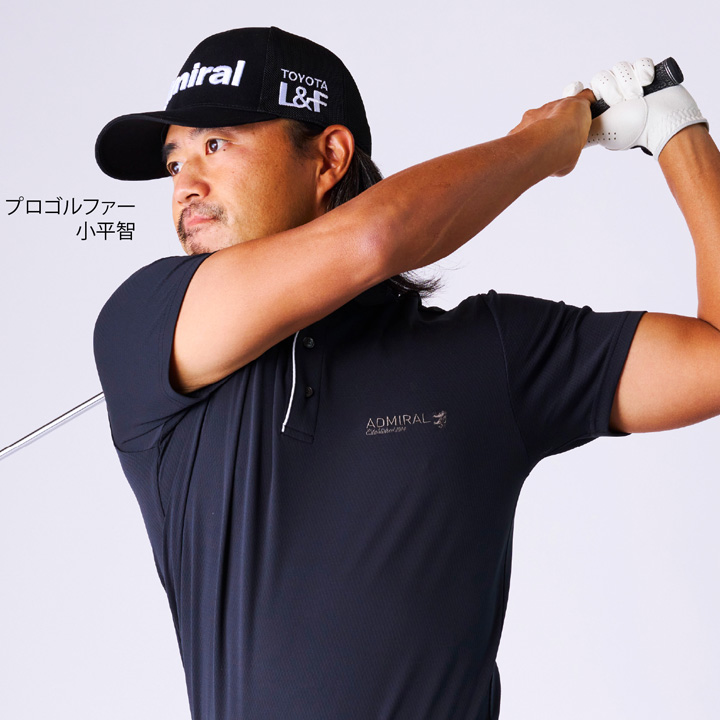 小平智プロが着こなす、今季イチオシの機能素材”カラタッチ”ポロシャツのコーディネート。「カラッとサラッと」した肌触りで通年着回しのできるポロシャツに、定番のパンツを合わせた力強いオールブラックスタイル。