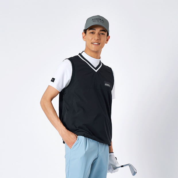 オールシーズン快適な着心地のカラタッチシャツと、撥水機能を備えたベストのレイヤードコーデ。ストレッチ性に優れたブルーグレーのパンツを合わせると、スポーティで上品な着こなしに。