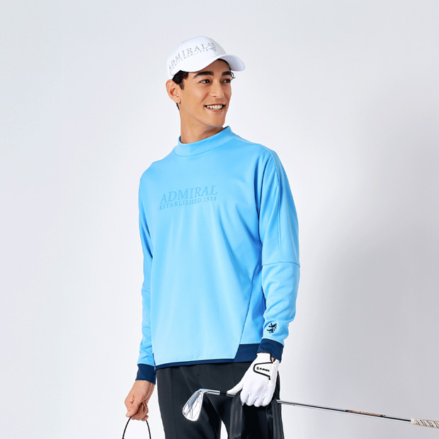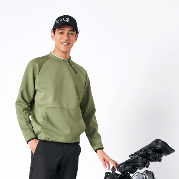 ストレッチ性&もっちりとした弾力感が特長のスウェットと、360度ストレッチが効くパンツのコーディネート。袖口に施したエンボス加工のロゴが、シンプルな無地コーデをワンランクアップ。